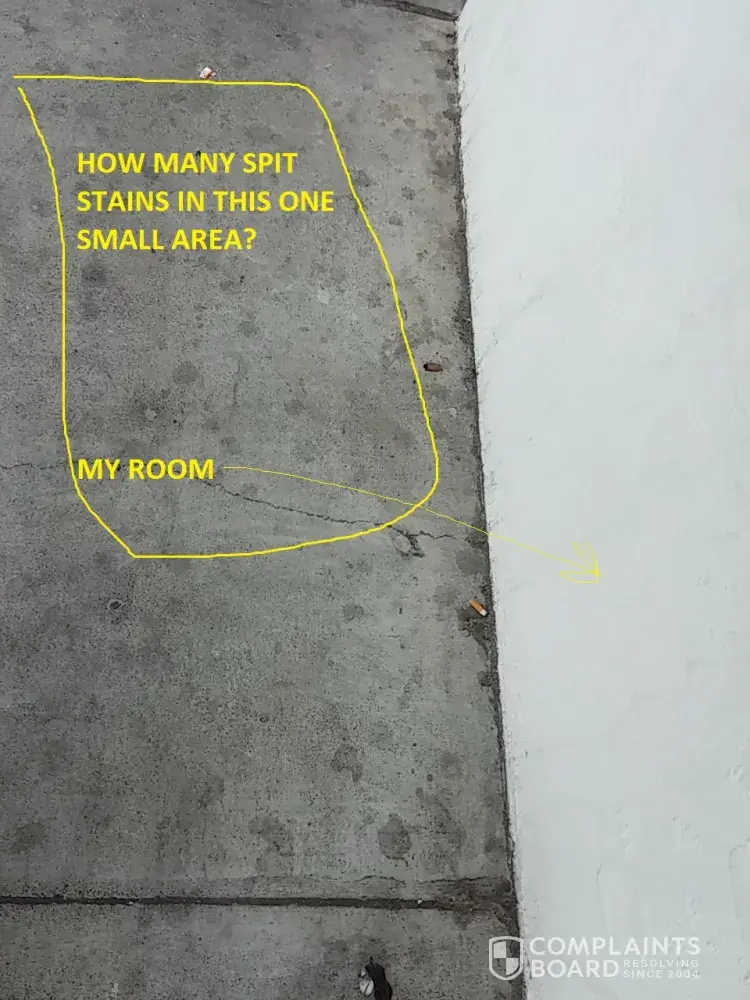 When I finally ventured out into the day light I saw the absolute filthiest walkway and parking areas ever. I've attached photos for clarity. Spit, b*tts, mucous, and stains... Plenty of unwholesome bacteria.