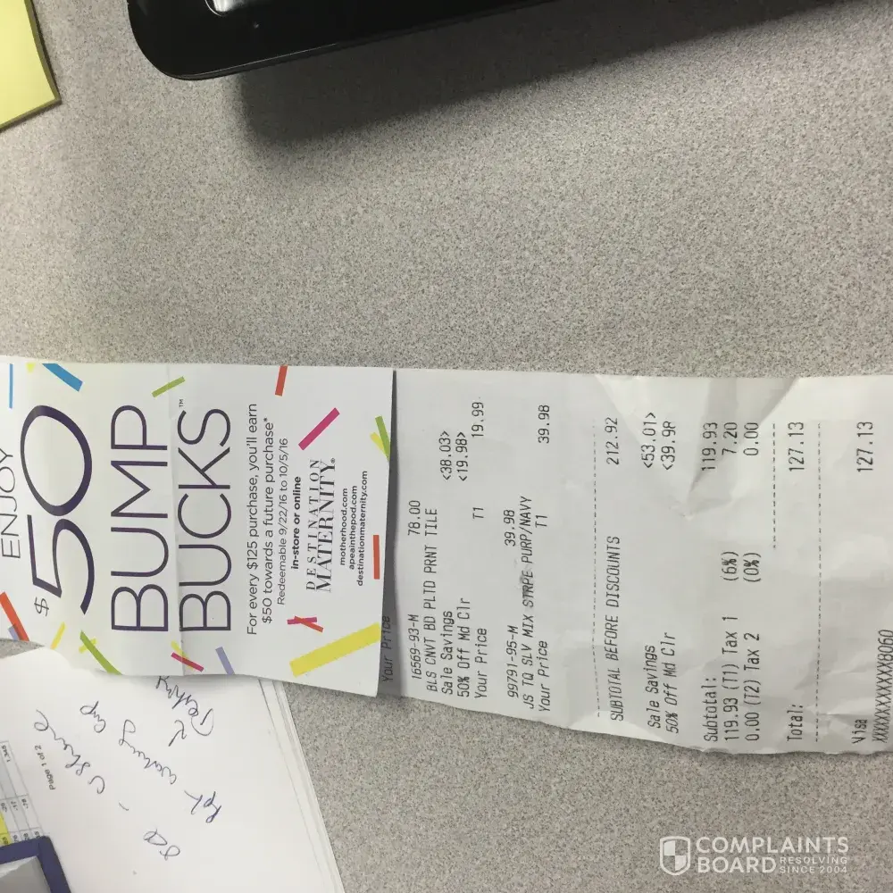 Well, to start with my experience, I went to Simpsonville Outlet mall in the end of August to buy some maternity wear at Destination Maternity store. This is a sister store of Motherhood Maternity. I bought clothes worth $119 and with taxes it came to total $ 127.I was given a $ 50 worth Bump Bucks coupon that is valid to use from Sep 22, 2016 thru Oct 5, 2016. I was also told that I could redeem this coupon in Motherhood Maternity store in Oxmoor mall. So, when the date came to avail my coupon, I went to Motherhood Maternity in oxmoor mall to buy some more. When I entered the store, a lady came by to greet me and asked if I needed any help. I showed her the Bump Bucks coupon and confirmed if I can use it here. After she said that i could, I started shopping and went for billing. At the billing, another lady said that i could only use the coupon if I spend additional $125 that day (the former lady with whom I confirmed was nowhere to be seen). I misunderstood her thinking that I had to spend again since I had not bought this coupon in their store.