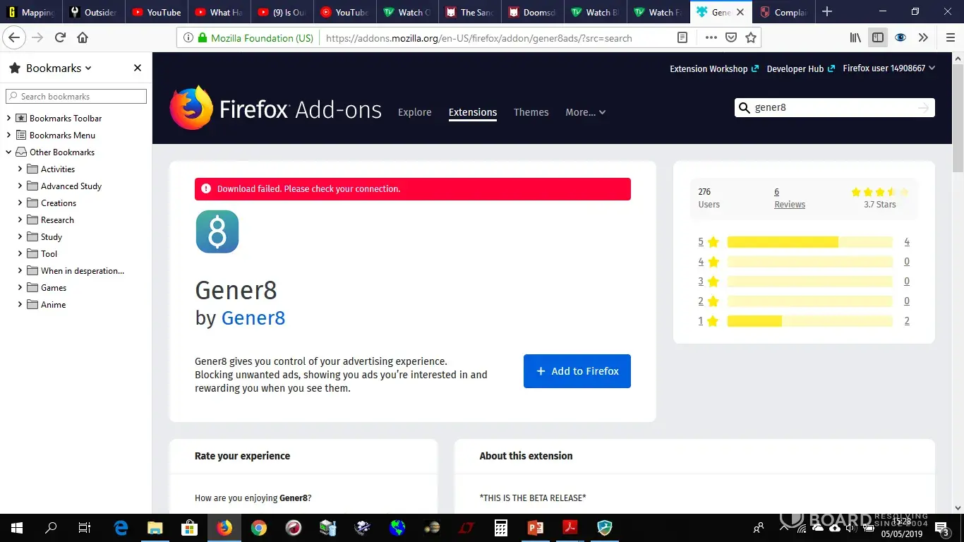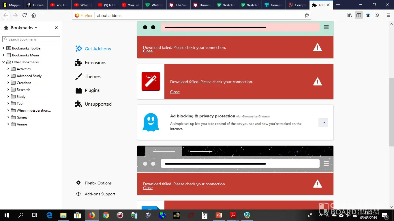 Initially, all of my addons and web extensions were deemed unsafe and were removed from Firefox, even after using these addons for more than 8 months, then when I tried reinstalling those addons, the message "Download failed, check your connection" will pop up. I have tried it for numerous addons and themes, including the ones that were preciously downloaded, but nothing worked.