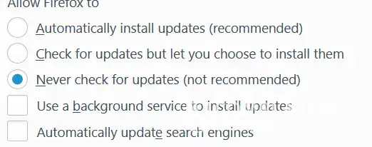 Mozilla just pushed an update to my computer without even asking permission. My Firefox setting is: Never check for updates! It is set this way because the last auto-update caused much grief because all drop down menus on all website failed to work. It was difficult to roll back the update because drop down menus to select an older version would not work.