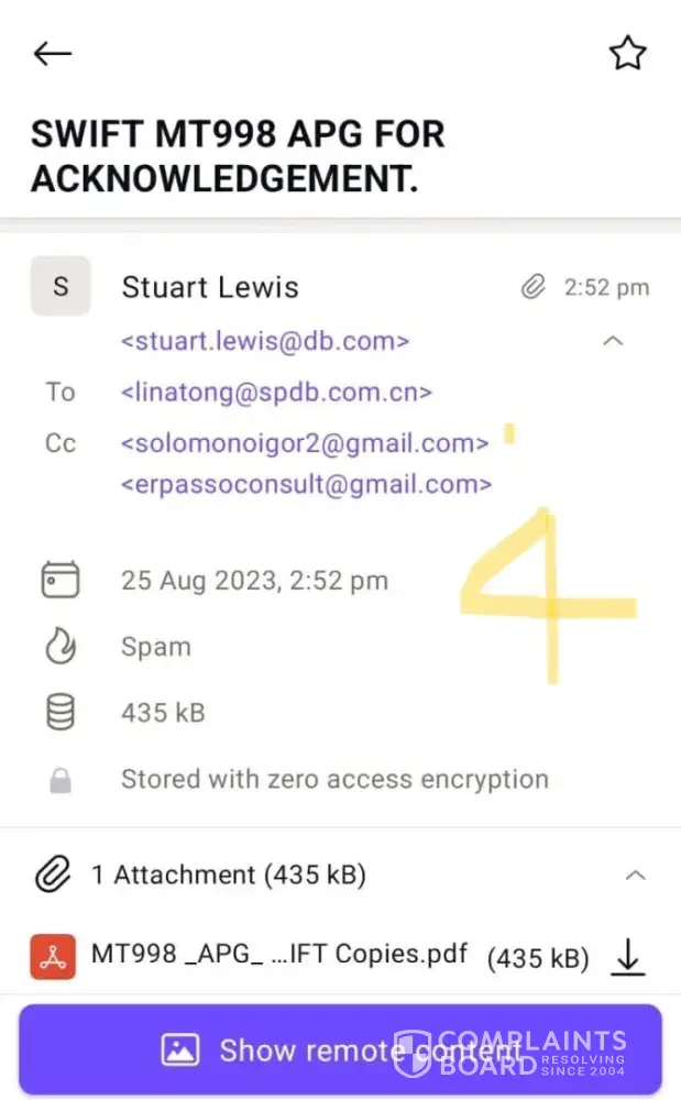 When asked why we were not copied in the email directly from Deutsche Bank when the bank sent the SWIFT APG to SPDB and the Provider, Dr. Marion Henschel, who should be in possession of copy of the instrument issued against her account, Mr. Onwudinjo claimed that Deutsche Bank could not reach our emails. He then sent us a screenshot of the email addresses that were supposed to receive the email from Stuart Lewis stuart.[protected]@db.com (who at that time was no more an employee of Deutsche Bank) (Document marked 4.) and that the mail sent to SPDB was delivered. (Document marked 5.). In effect we never got any correspondence/copy mail from the so-called Dr. Marion Henschel of Strabag AG or from Deutsche Bank, the issuing bank. All we received were from Mr. Onwudinjo himself.
