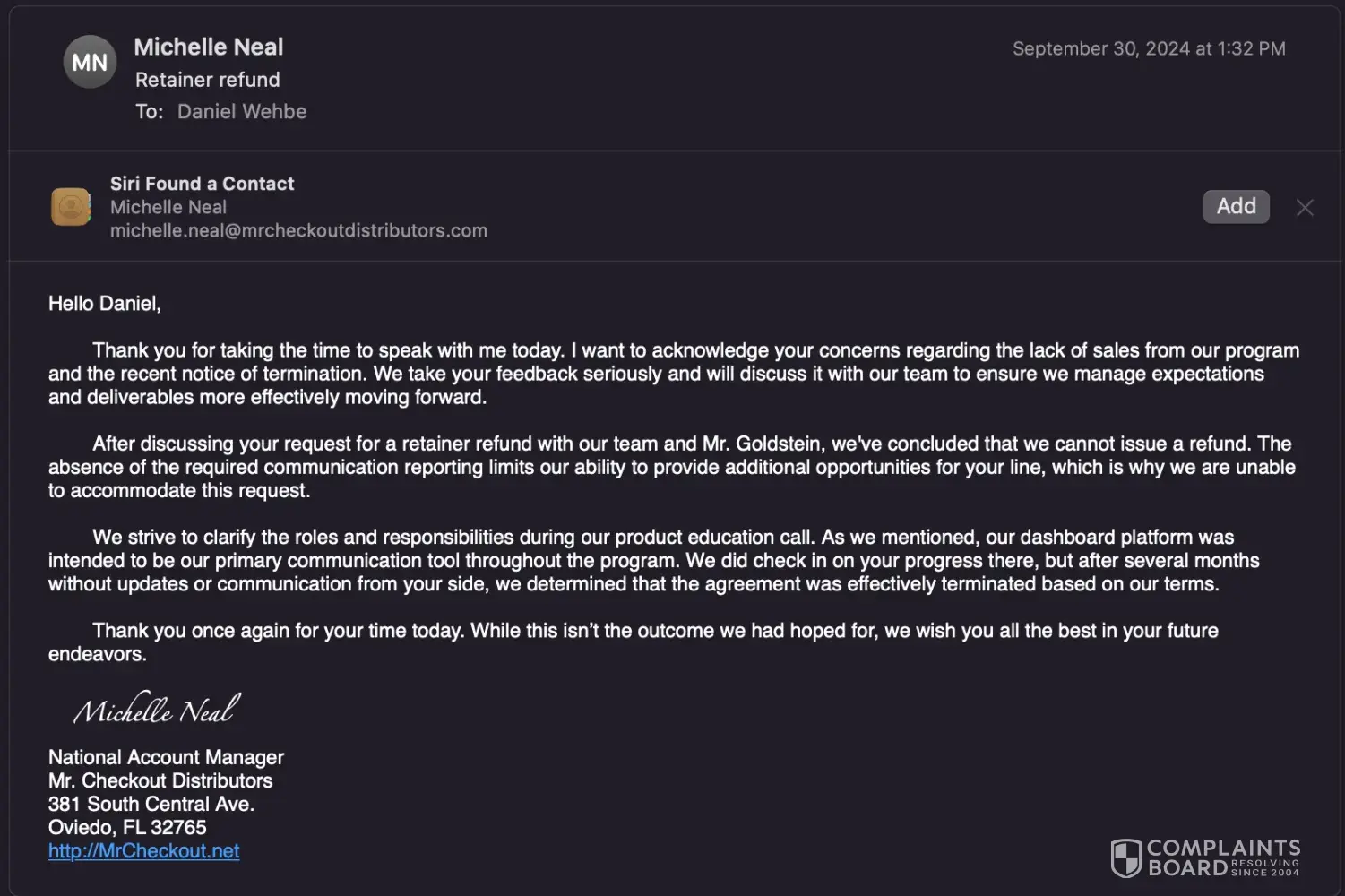 But when I reached out to get my money back, Mr Goldstein did not make himself available to me (like he did in the beginning).. Only Michelle Neal was available, and she told me that even though they said I will be refunded, my contract had been terminated without forewarning since I was too late to send a sample to one of the leads.