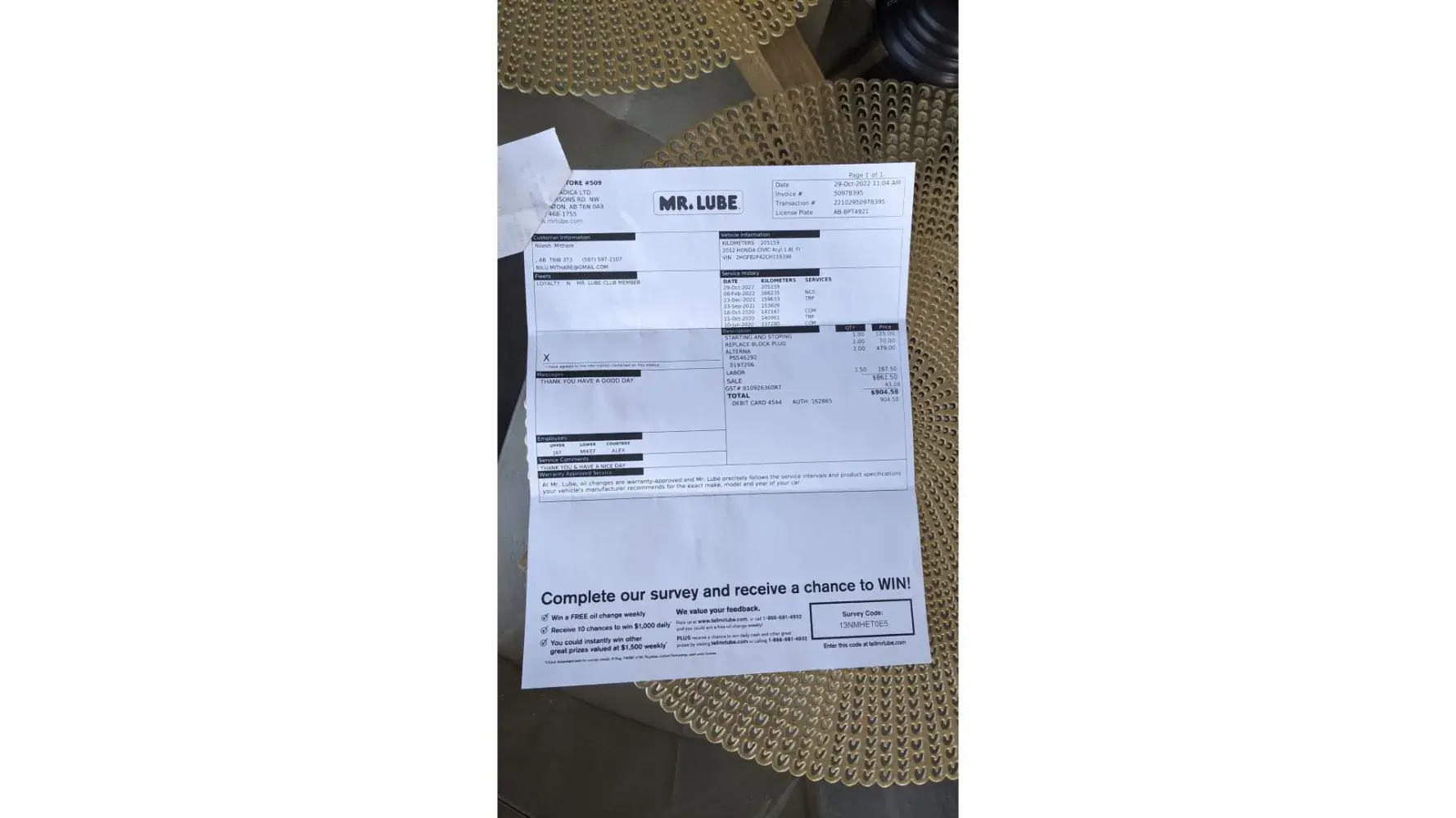 I was having battery issue while starting my car few days, so I went to same Mr lube in Walmart Edmonton south. I was charged $125 just to see my battery and $187.50 for labor charge, I asked why $125+$187.50 just to change alternator, manager got really upset and didn't give any explanation and really rude. I hope I can get any help for this overcharging scam