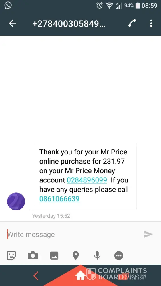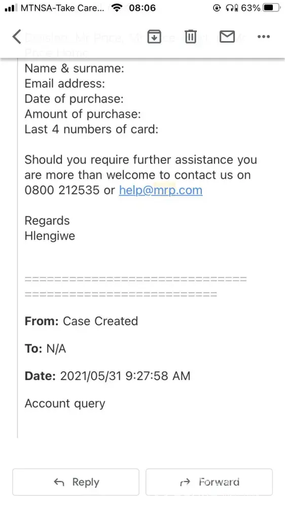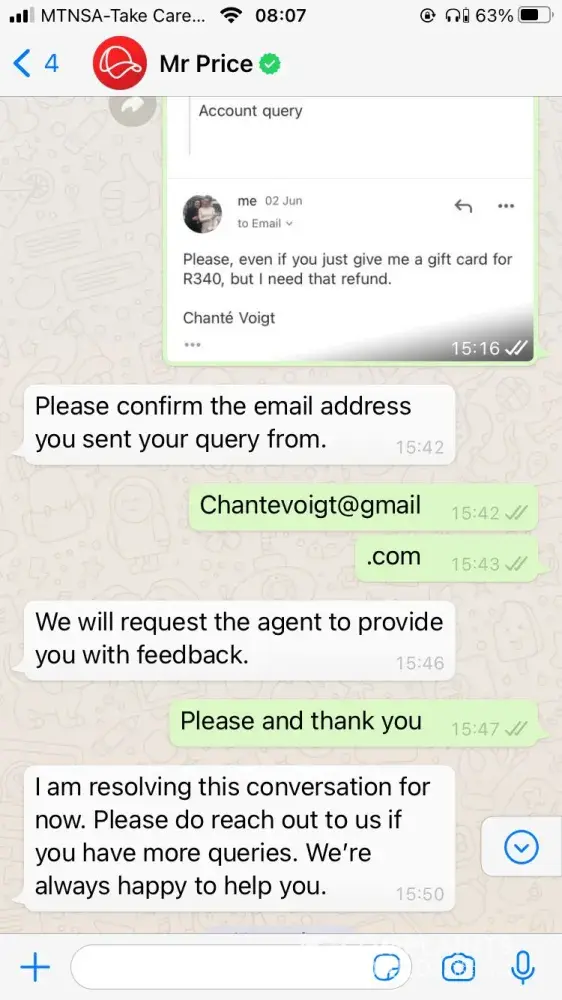 My husband went to Mr Price in Bethal on many occasions, trying to resolve the matter on my behalf, but still without any success.