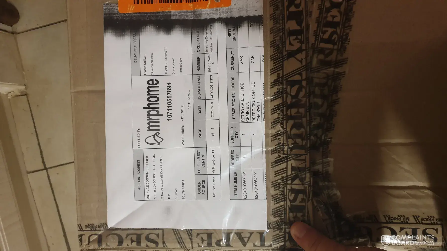 I ordered two Retro Cruz Office chairs from MRP Home (order number [protected]). They were delivered today in an open vehicle and poorly packaged. The boxes were not properly sealed.