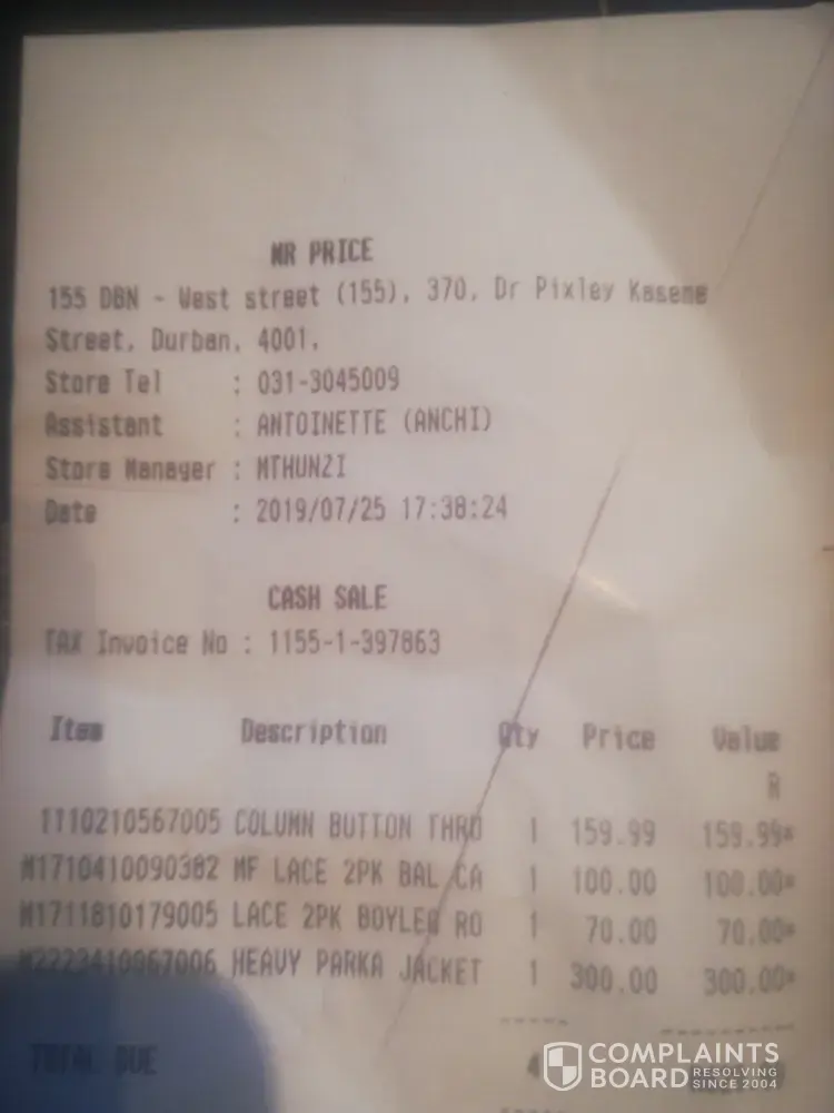 I was at Mr Price (370 West street) branch on 25/7/19 in the evening and nearing to the closing time. We stood in a queue for "card payments" only and the machine had a problem so the cashier left, without communicating anything with us. It was only until i asked another whos attending us because the cashier just left without explanation. Then they moved us to thr 1st counter where Antionette(Anchi) was assisting. It was such a terrible experience, im not a Mr Price fan and definitely after the [censored]ty service i received from her i will never shop there anymore and will tell others too. The girl was just in a hurry to go home and had no sense of customer service. Firstly, she dropped my dress and went on as if nothing happened, i picked it up gave it to her. Then she scanned a jacket and i asked her why the price is up because the jackets had red tags and that they were marked down...she gave me such an attitude, told me how will she know if she doesnt see the red tag, she won't know and i was very surprised at the rubbish she was asking me. She folded my clothes, put them in a bag and called the next person before i could even take my parcel. Im very disappointed at how Mr Price staff treats their customers and hope u dont lose anymore customers due to this.