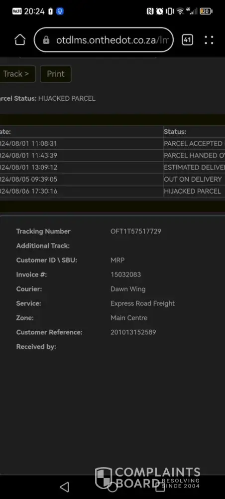 Order was out for delivery on the 5th August and I still have not received it and today is the 6th August 20:45 I checked online and it shows hijacked. No one from support bothered to contact me or return my request for answers to when am I receiving my goods! Order number: [protected]
