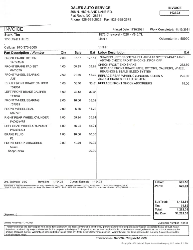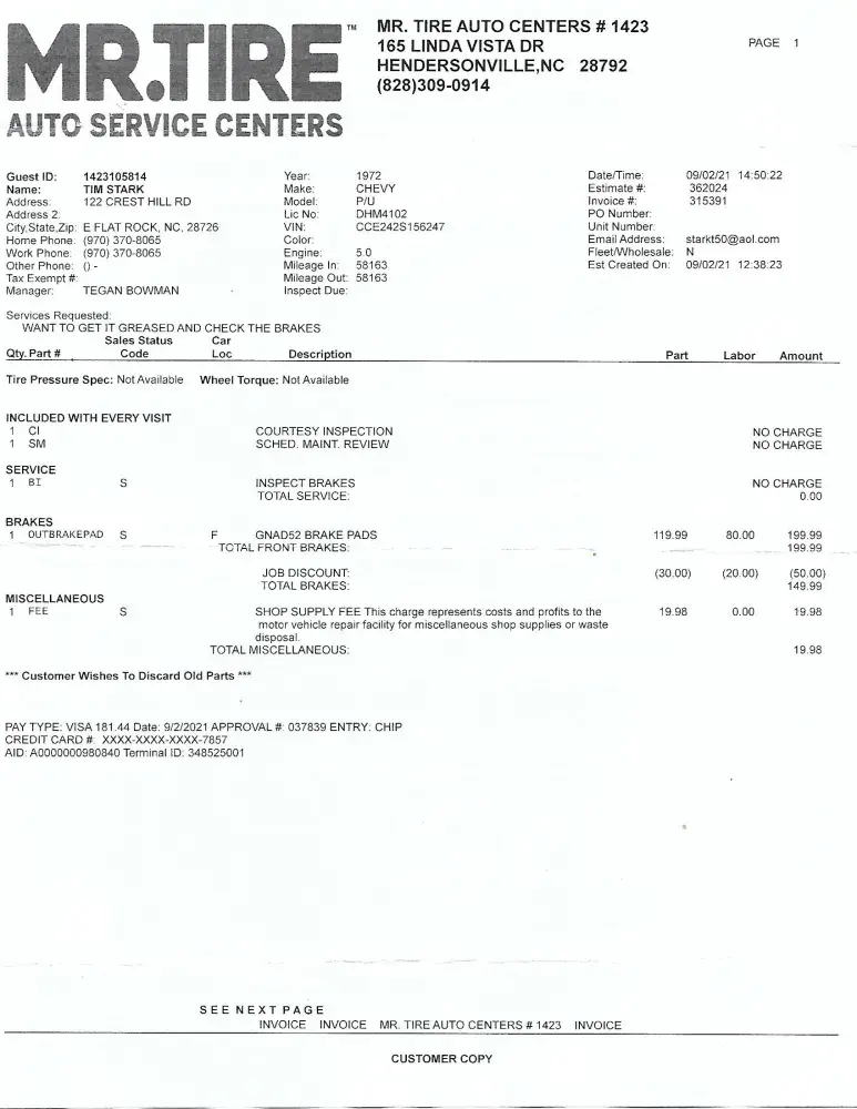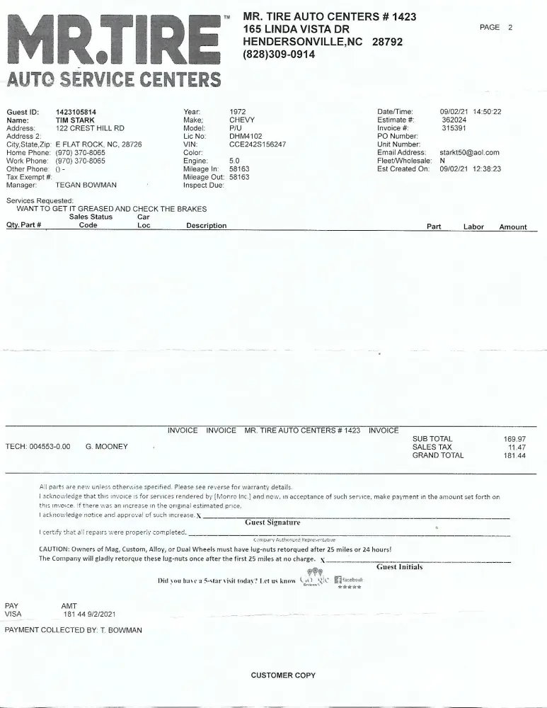 Complaint about service at Service Center #1423 Hendersonville NC I filed a complaint with Tegan Bowman on or about 11-12-2021 about a repair that I had done on 9-2-2021 in regards to replacement of my front brakes on my 72 Chevy pickup. The front brake pads were changed and the vehicle was supposed to be FULLY GREASED. I ran the vehicle intermittently...