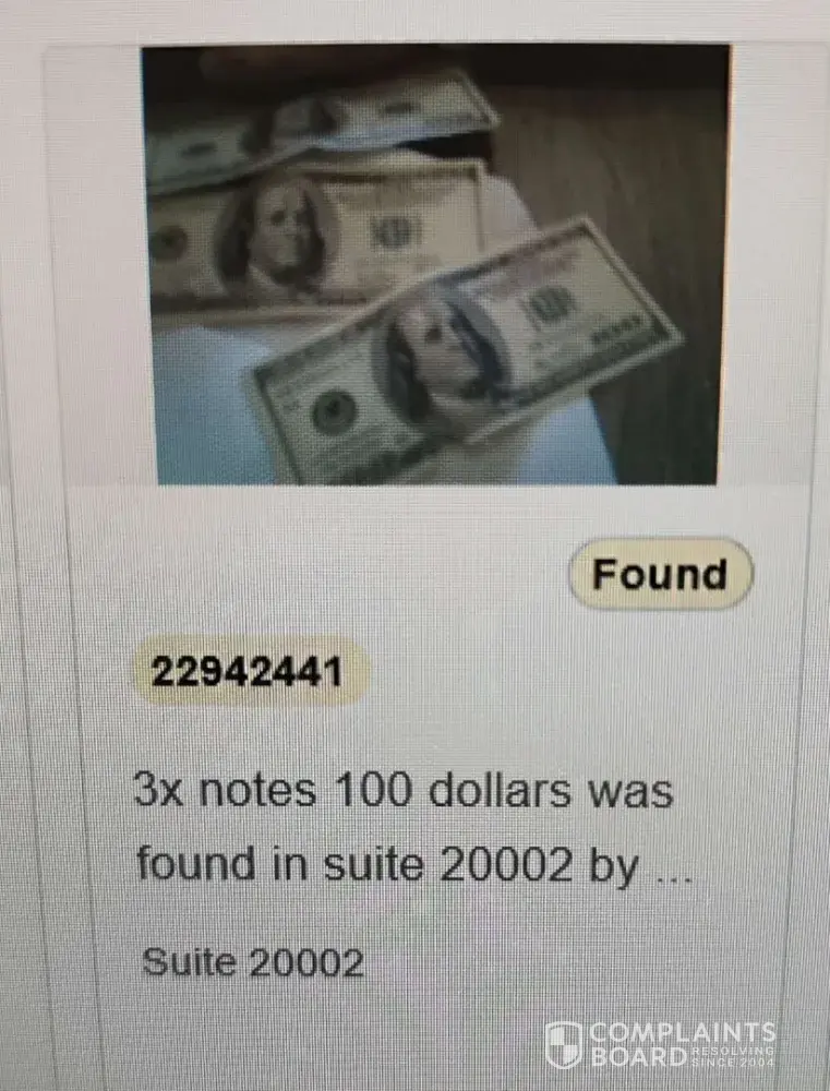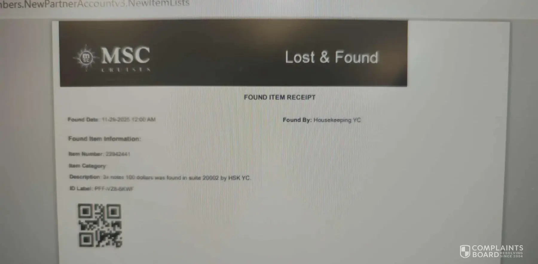 On 11/29/2025, I departed MSC World America. I left (3) $100 bills in an MSC envelope on the credenza, next to the phone, on top of the notepad. The money was found by the Butler Marco & Jr Butler Dewa. They turned it into the Yacht Club concierge William Singleton who documented the find and filed a found report with MSC. I emailed, mailed and called, but...