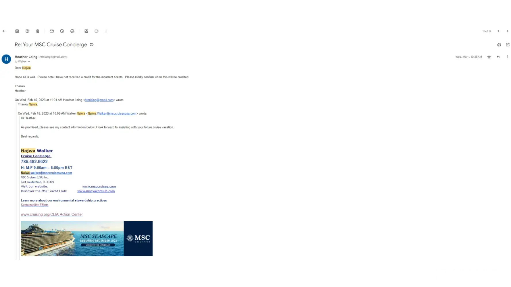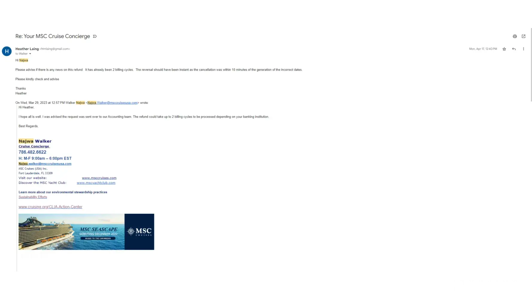 Please respond within five business days. I will be following up with MSC directors in the corporate offices until this matter in resolved appropriately.