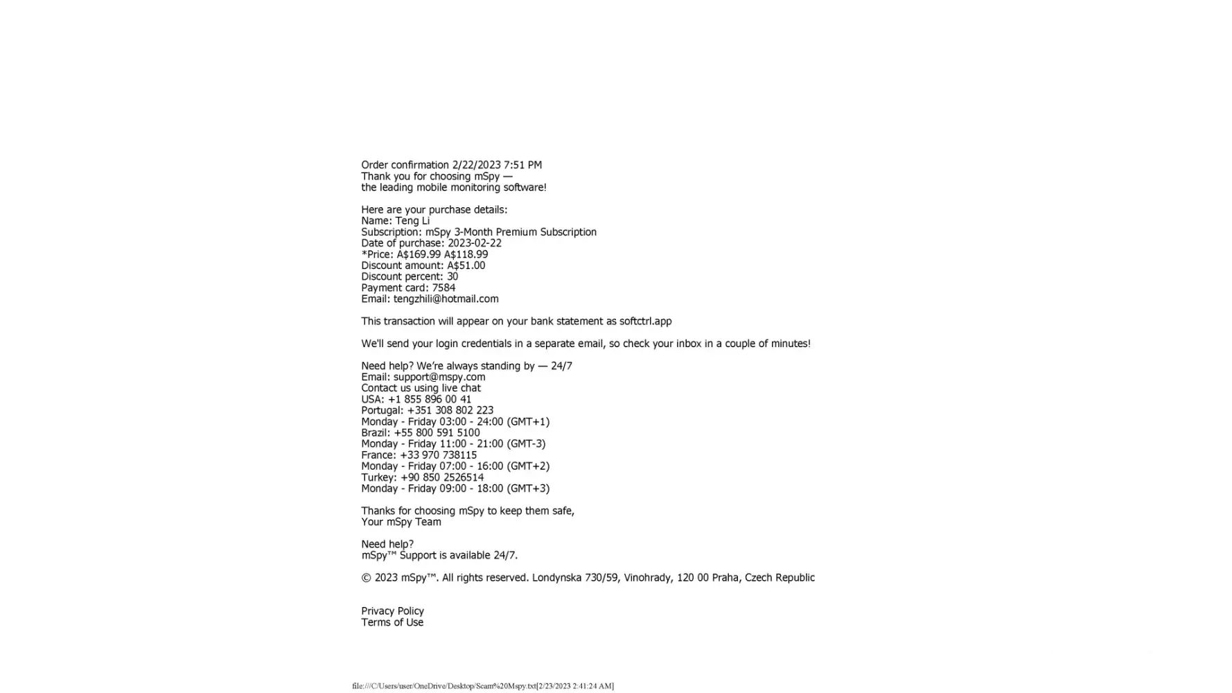 mSpy Refund request on a fraudulent transaction carried out with a stolen card and phone