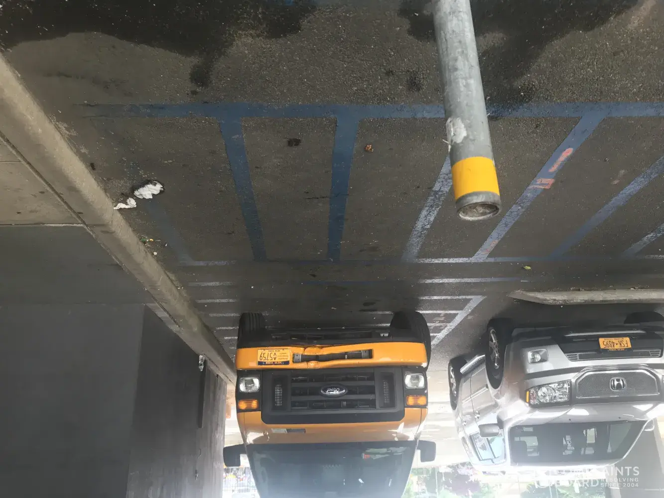 This van has been here at least 3days...notice the blue lines under the van. These spots are striped, so if a HANDICAP van parks CORRECTLY next to it, there is room for its ramp to be deployed. Your employees DISRESPECT for local handicap citizens is ATROCIOUS !