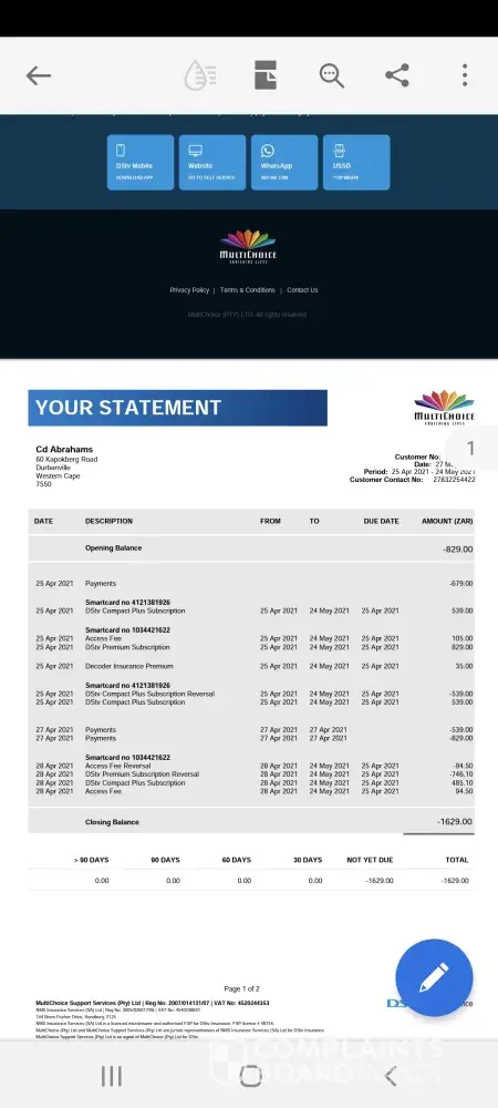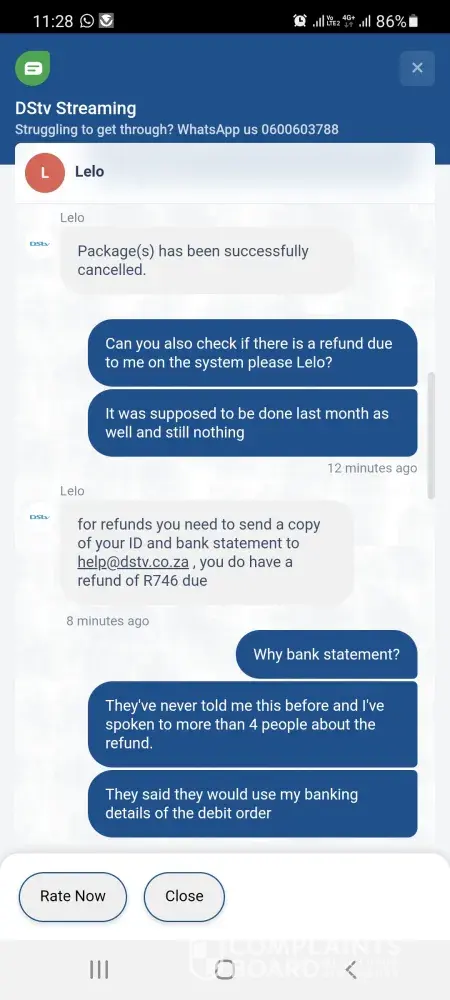Good day . I would like to report unauthorized access to my dstv account. packages have been added and credit without my knowledge. I only realised this when i saw i owed DSTV an amount of over R2000. I went into your Multichoice Cape Town branch at N1 City on 31 July 2021 and asked a manager to assist - who unfortunately did not know what he was talking about and told me to pay an amount cos one of their DSTV service centre staff members done a double credit on my account without my knowledge and i don't see how this is my problem or concern. He said i needed to pay that amount as i used the service. i dont check my bank account or debit orders to see what gets deducted or not but i paid anyway as i saw his statmement fair. I paid an additional amount of R1377 extra to the amount that was already debited from my bank account. i asked for my account to be cancelled immediately as i wanted nothing more to do with them. i walked out, checked my account only to find it was not cancelled. i went back in to DSTV and asked to speak to another manager who advised i did not have to pay the amount as it was not my mistake and said my account had not been cancelled yet. i asked him to cancel it and they cancelled it and he said there would be a refund due and asked if they could use my debit order banking details and i said yes they can. Up until today i have spoken to over 5 customer service agents via their live chat platform and every single one of them is giving me a different story as to how to get my refund. i honestly just want my money and get rid of this people and not deal with them at all anymore. Please assist as i am tired of it all and i have had it. during this time packages have been added and credited as well. Please can someone just sort this out and equally train all your staff members the same way with the same information. i come from customer service and this is horrible service even from a manager. A few names i remember is Lelo, Nthabiseng, Ntokozo - all giving me different information about a refund due to me. I do not remember the manager's name as i was not going to complain but did not know it would drag out so long. i just need assisting and asap. Thanks so much. Best regards.