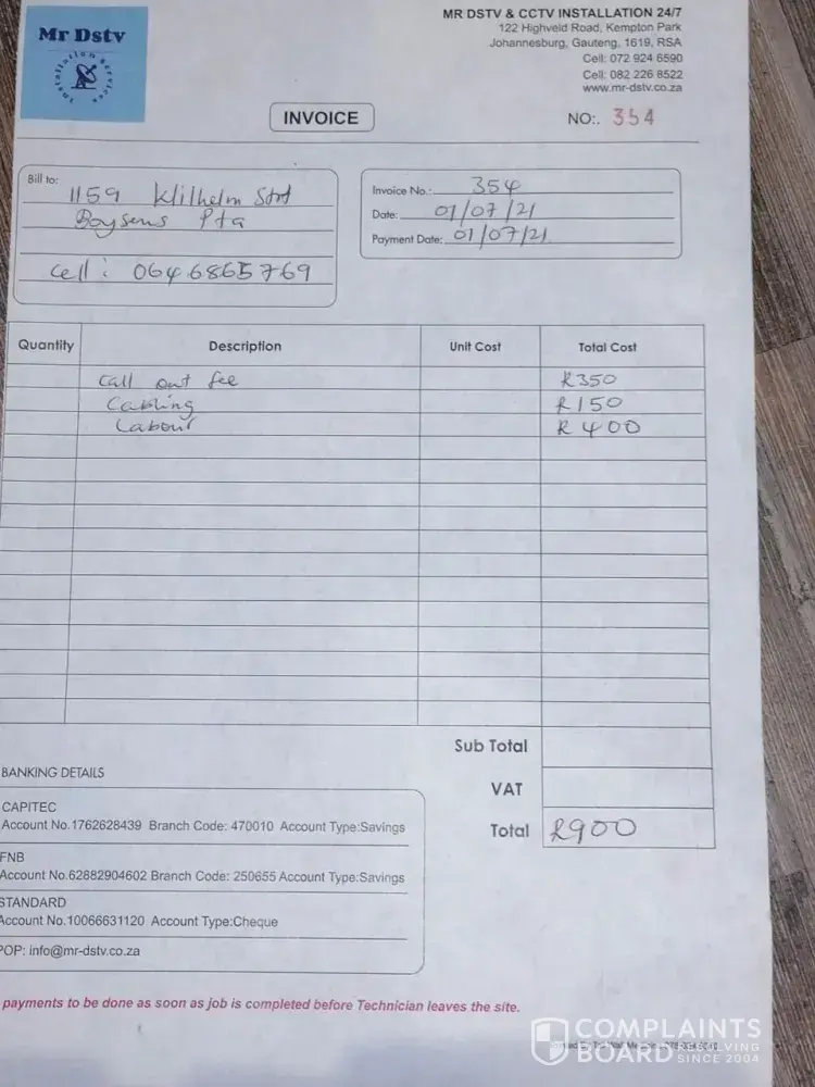 When they were done installing they indirectly demanded the old people (my parents)to pay them R900 (invoice attached)
