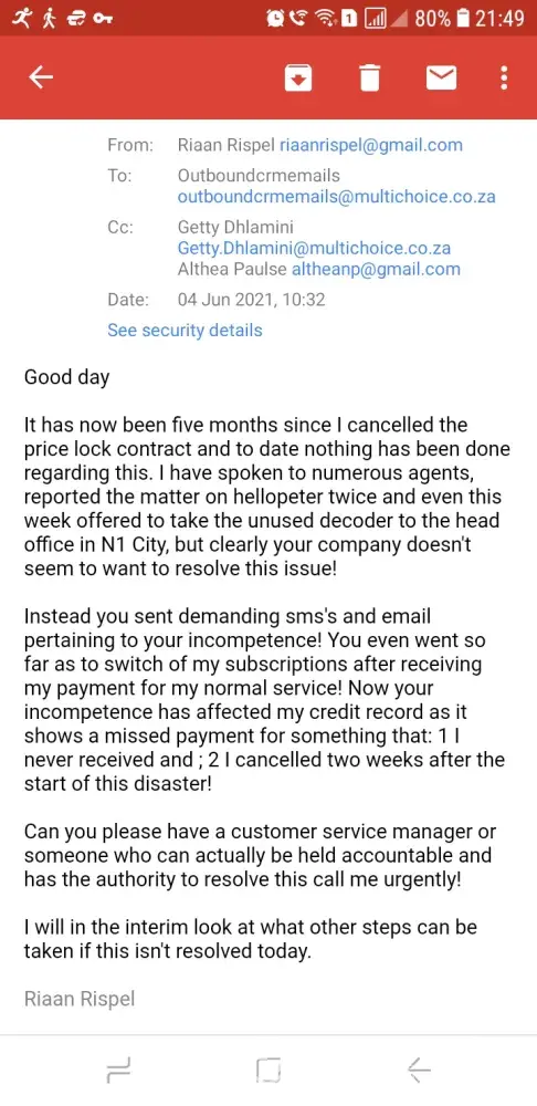 Desired outcome: My viewing to be reconnected and a written apology from Multichoice