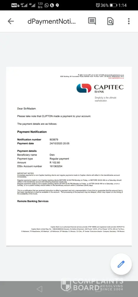 Surprisingly, I asked the supervisor about the amount I got form the App and which is exactly what I paid and he said the amount is based on a pro-rata which is fine. I then said to him that I always use the app to pay and have never experienced this type of a challenge but he maintained his position. My question is, I have already paid in advance for the month of November 2020, but my services have been disconnected due to alleged outstanding monies owed by me to Multichoice. Fair enough, yes I am aware of those outstanding amounts of which in the previous months will be carried over and paid on the next payment date. Now I am sitting with an additional R50.00 which I must pay for services which have been terminated and though my payment date is the 30th of every month thus relating to me losing R50.00 unnecessarily. I was under the impression that all outstanding amounts owed to multichoice will be paid on the due date together with the payment for the following month.