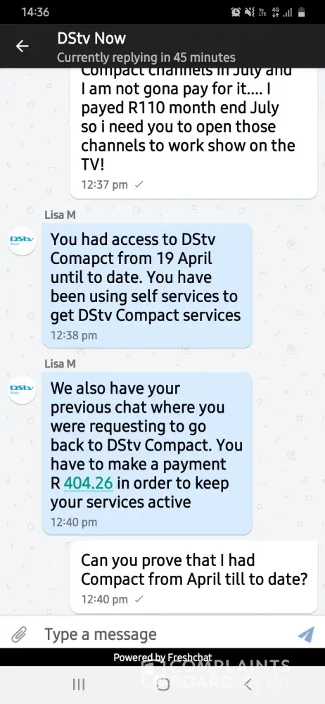 I am really crossed, to start DSTV customer service suck you would swear the agents were never trained. I upgraded to compact in April and I didn and I had an amount outstanding in June to view and payed it off and downgraded to the R110, went to pay in store month end June and they said I was owing R90 something because in June I paid extra a bit. July the 27th I payed R110 again on my FNB app and ever since month end June channels that were playing on TV were for R110, today on the TV its disconnected but still plays on my DSTV now with channels of R110. They say it is closed on the TV because I owe R404, I contacted theLiveChat the worst spoke to Lisa M or something and she told me I am on Compact since April tilll this day but for 3 months I didn see the compact channels. I contacted them for clarity now they say I owe R80. I am not owing anything I am supposed to pay R110 month end August, the TV is not playing... no one is sorting this thing out... this is [censored]en ridiculous