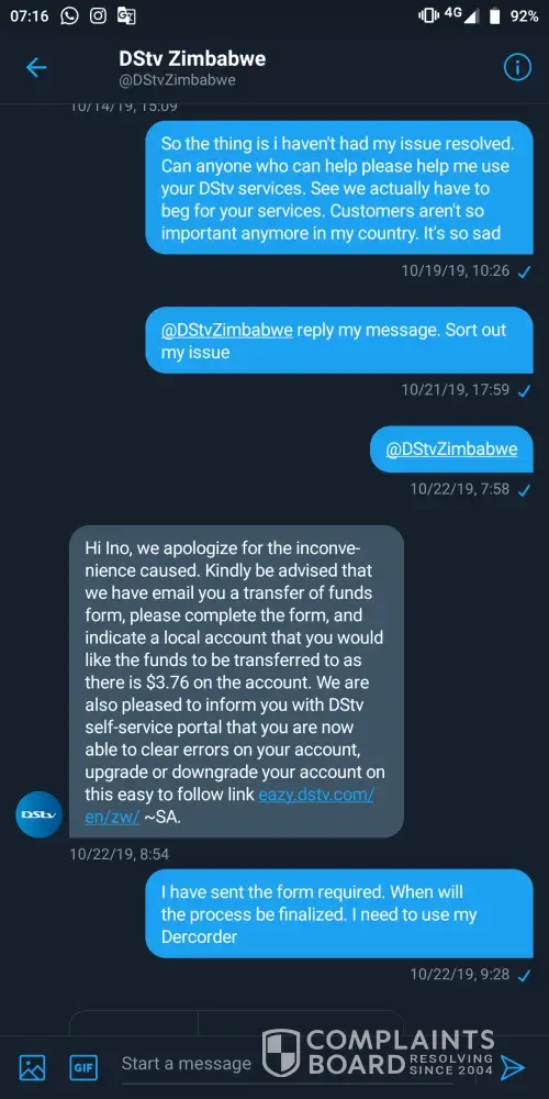 I want my matter resolved with urgency so I can be free of dstv..