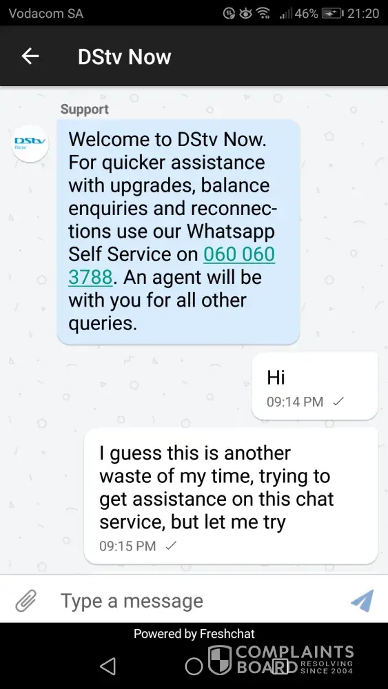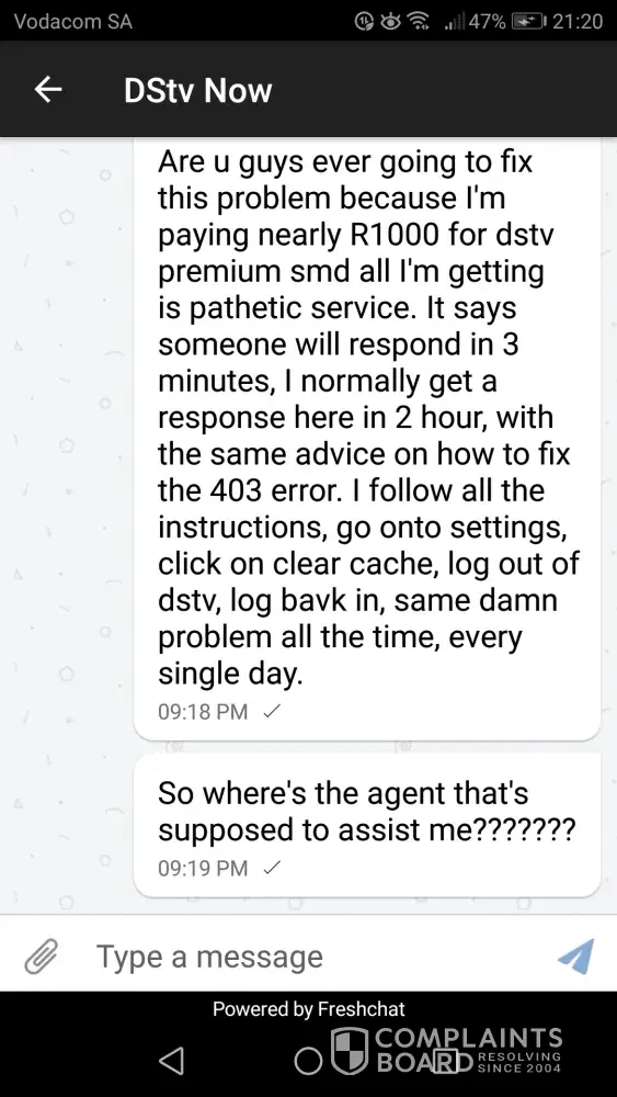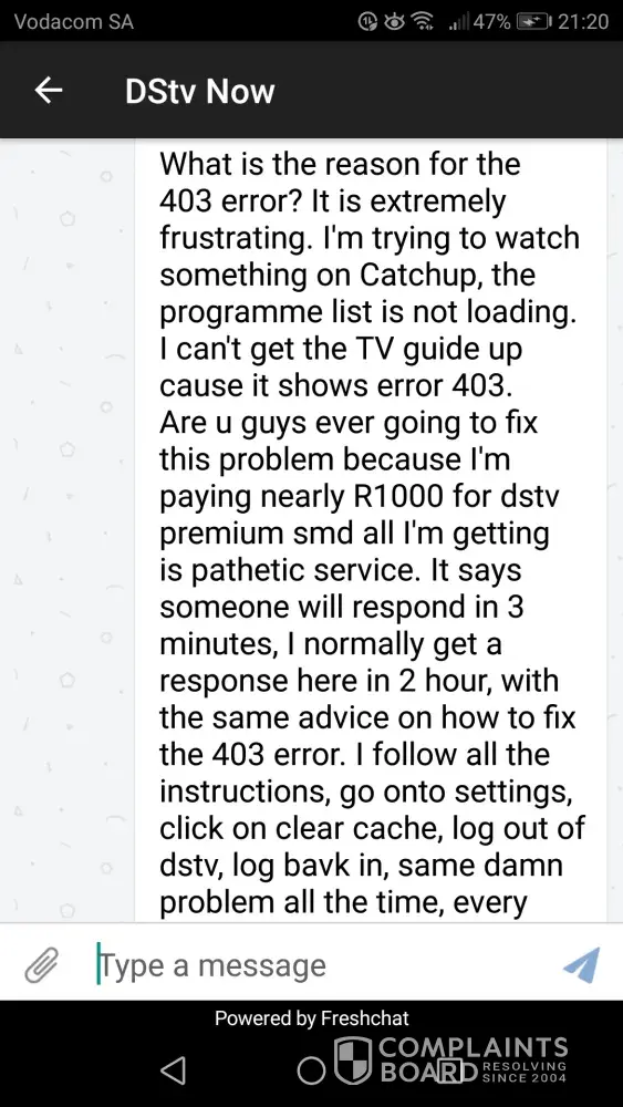 Please see attachments. Screenshots of my attempt at getting assistance on the DSTV chat service. That service is useless. Paying almost R1000 for dstv premium and getting such pathetic service daily is just unacceptable. Every day I can't get to see the TV guide or watch shows on Catchup due to a 403 error. I start a chat on the chat service to get assistance, and no one responds. Sometimes if I'm lucky an agent sends a message an hour later. Some days, nothing. Cab someone please get this message to DSTV management and ask them to do something about this problem. It is extremely frustrating.