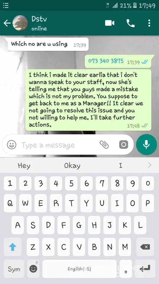 To the young lady who helped me, you told me time and time again that you understood my situation, but it was clear that you did not... training to say sorry and that you understand means nothing if you dont understand or offer a common sense solution to the problem. I have to push and push and waste my time with this to get a satisfactory outcome for the customer...the people who ultimately pay all DSTV employees wages!