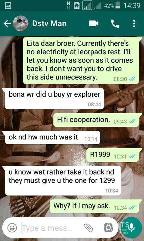 On the 20th Dec 2017 I bought Dstv explora from HiFi corporation on special for R1699 from R1999. On the box of the decoder there's a yellow and white sticker that serves as a voucher that mentions that the purchase includes free installation that comes with a dish and a smart LNB, and this applies to within 25km radius. Since 21st Dec 2017 I have been trying to get dstv installers to come and install the deal I bought but have been failing. The response i get from some is they no longer do installatios which come with free installation, I've had a response that says I should take the decoder back to where I bought it and buy a cheaper deal. The last disappointing response from dstv agency in alberton-new market shopping center- was they don't do installation on equipment bought from HiFi corporation. On the 28th Dec 2017 called dstv call centre to relay my situation and get help. The consultant took all my details and promised that she's sending my address to the installation department and someone will come and install on the 29th Dec 2017. Since then no one came or called to inform me about when will they come to do the installation. Today on the 2nd of Jan 2018 I called dstv call centre again, by luck the consultant who answered is the one who attended to my call in the past since I started to have a problem with installation. I told her I feel neglected because after my calls no one makes sure that I'm helped or not. She suggested she'll give me the numbers to their installation department, unfortunately not having a pen with me and driving, i asked her to send me all the details via email address to my email address which dstv has and I confirmed to the lady. She said she will send the contact details. I also asked her to take this matter to her superiors to have a solution to this matter since I'm a paying customer who activated his account on the 21st Dec 2017 and already a deduction was made in my bank account for dstv account but don't have the benefits of seeing what I paid for.