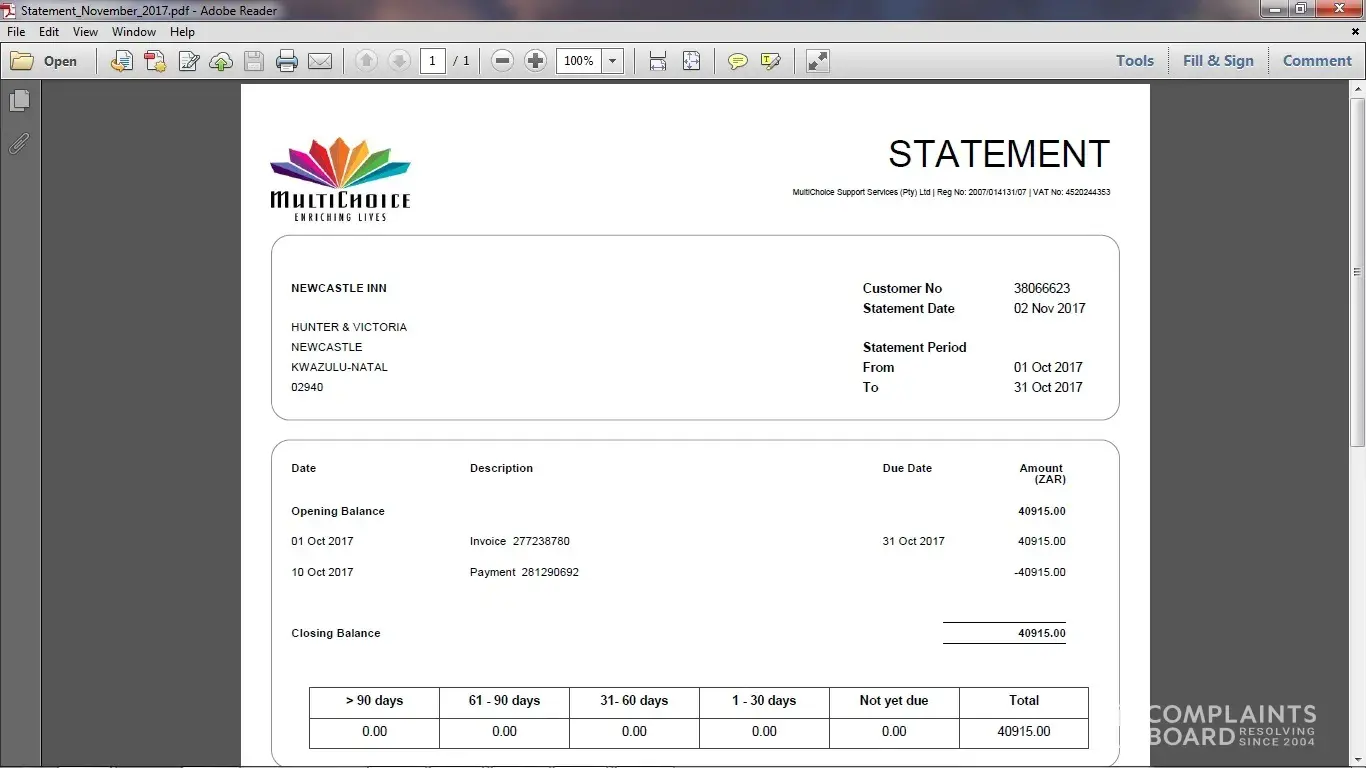 I then phoned this morning 16.11.2017 and was then told that I need to send my proof of payments (which dates back to November 2016) to [protected]@multichoice.co.za Ref# 9423469