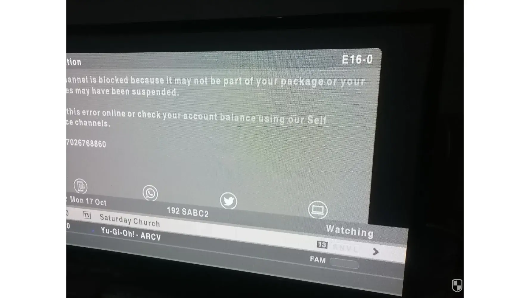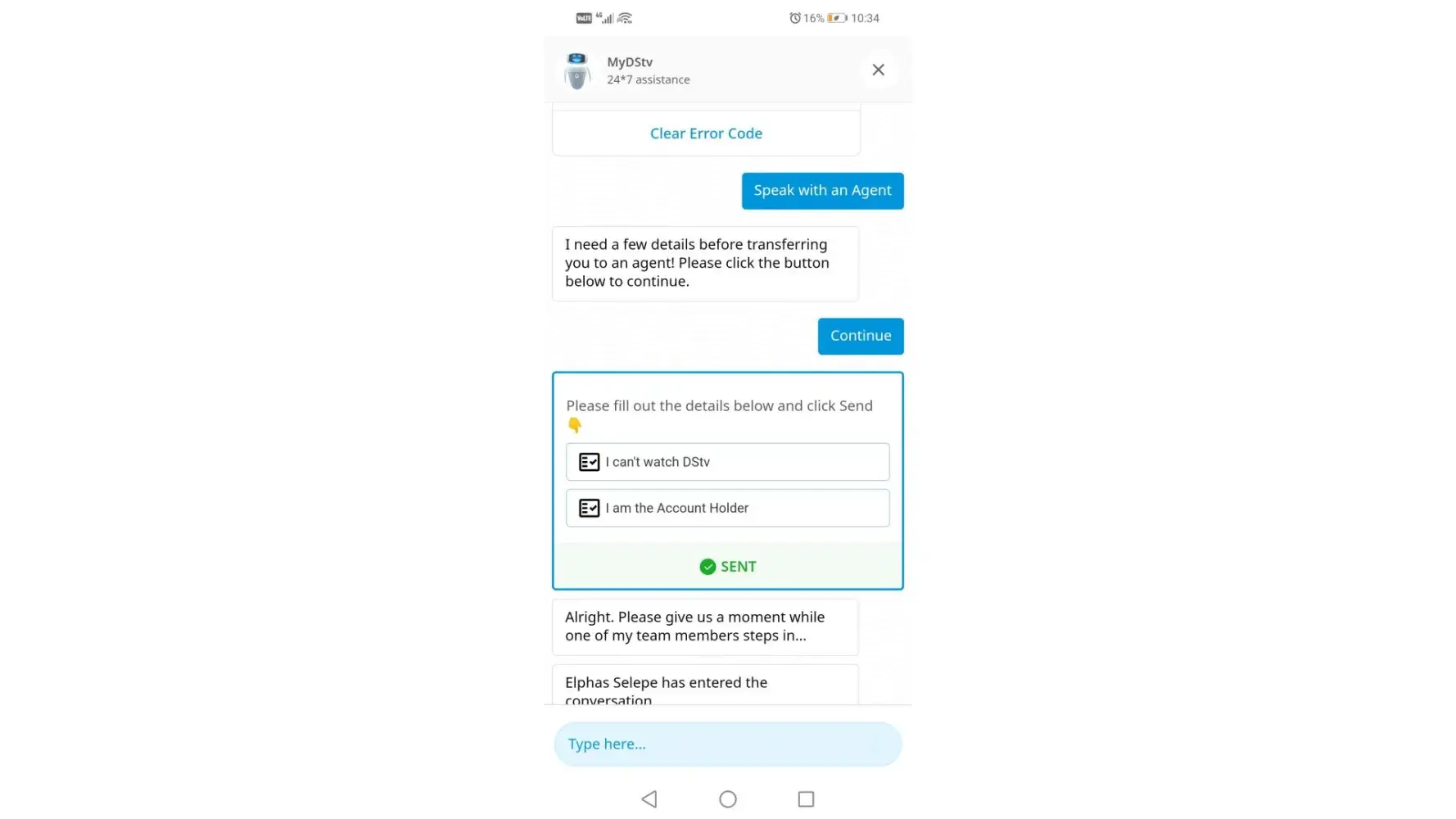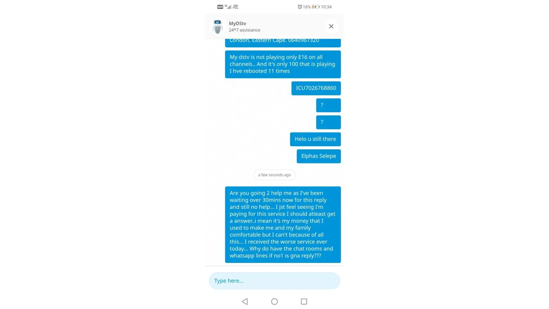 I keep on getting error 16 when call multichoice they place me on hold for more than 15 minutes the only person that was able to clear this error was Tsepang Lepakeng while when I spoke to Siphosihle she refused to provide me with her surname call reference is [protected] she was the most useless agent I don't weather is she hired to sit the for the internet or what.The error came back on the 14 of October I called today spoke to Nolubabalwa Bhoqwala who placed me on a hold and told me she will get back to till now she hasn't I spoke to Nokubongwa Mncineka still nothing I'm at the point where I want to scream my heart out proof of payment was sent to multichoice I got a reference number for proof of payment only Tshepang was able to help can y'all get him to call me back since he is the only agent knowing what he does there immediately now and today [protected]