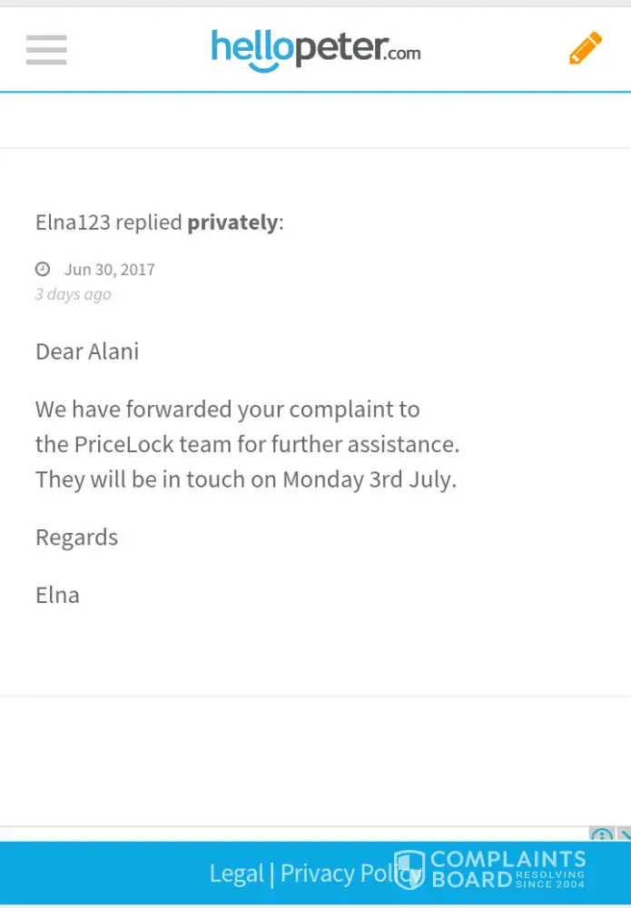 I am still waiting a response from you concerning my set up of the pricelock…? First email was sent on the 6th of april and to date I am still waiting for you to reply…