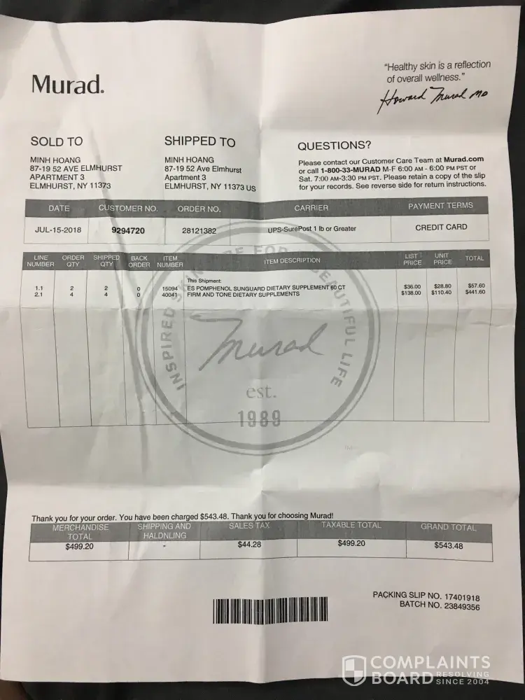 Overall, my experience with Murad.com was terrible, and I will not be ordering from them again. It's frustrating to spend so much money and not receive the level of customer service that I expect.