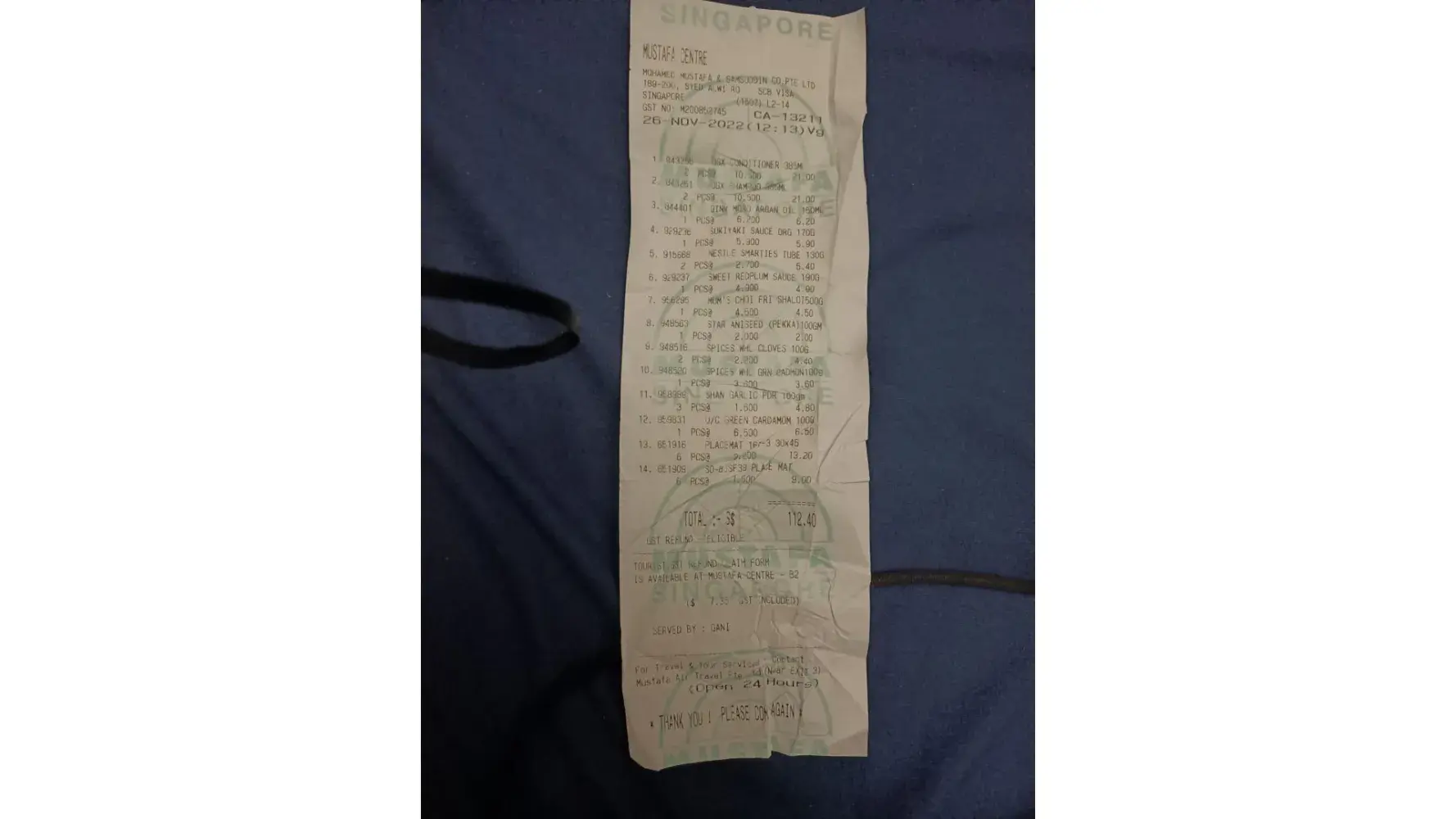 I , visited your shop on Thursday ( 10 Nov ‘22 ) @ 13.34 pm to buy 14 items at a total cost of $42.35 , receipt number (CA-65496) . Items include fruits , house hold items and chopper knife. After payment the cashier just put the items and knife in the plastic bag and give it to me.