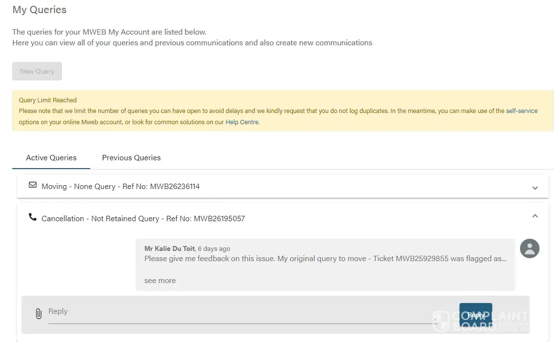 I gave notice of moving on 14 nov 2023. They simply take like 6 days if the do, to respond to emails. Phoning in if your call do get answered the same problem has to be repeated over and over. Despite sending the correct address details, i even got a congratulations email fro mweb stating installation was done. Wow no ont box in my init and nobody contacted me for access to my home. Today 11 dec 2023 i am still without connection and no contact from anyone. My mobile data is depleted due to no fibre connection and therfor want to cancell without obligation to pay one cent further to this pathetic no service by mweb. You can not even reach them telephonically. I am done