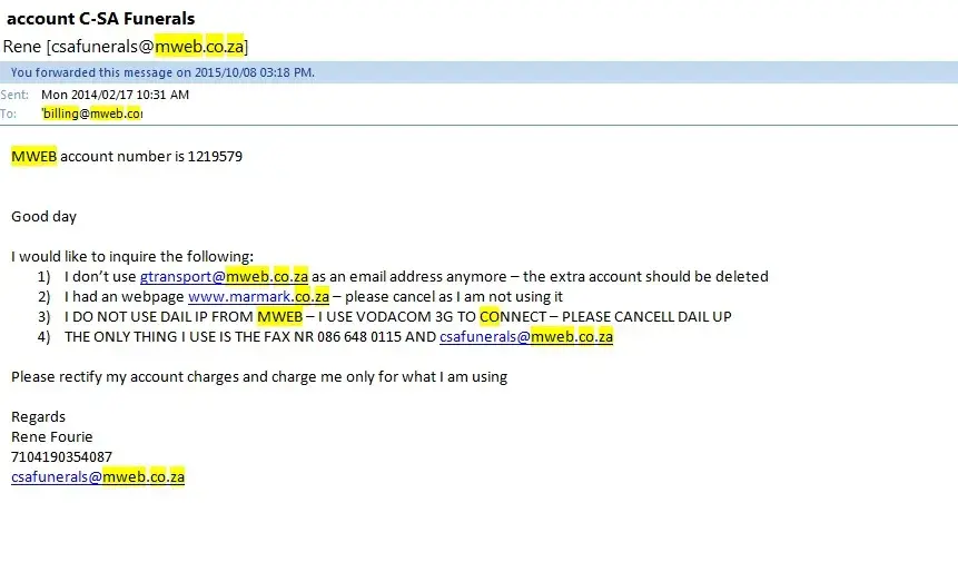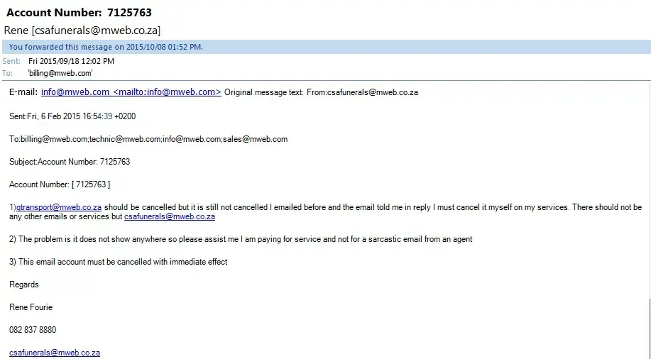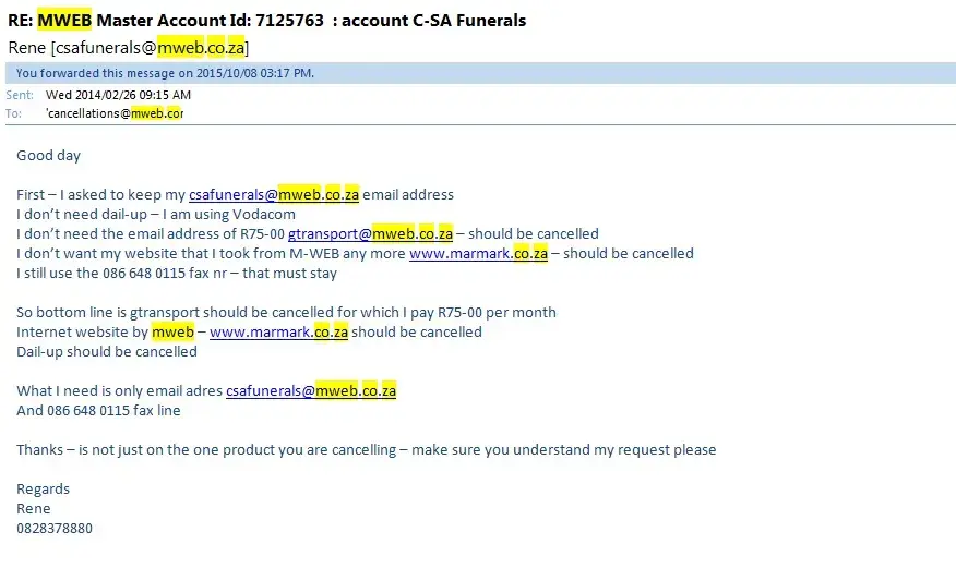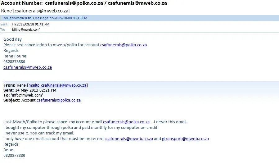 I cancelled my email address which polka gave me - when I purchased a computer through them - On 14th of May 2013 I emailed [protected]@mweb.co.za to cancel [protected]@polka.co.za - I thought the email was cancelled. Again an email was send on 26th of Feb 2014 where I specifically ask Mweb to cancel all other products which they are deducting through my account but leave my one primary email address. When Mweb did not take notice - I cancelled my debit order. I made a complaint on Hello Peter - one agent tried to assist me and then he also disappear - I emailed all my emails to Mweb Accounts for their notification - I thought everything is resolved...all of a sudden I get a sms I am being put on Credit Bureau for non payment...Mweb call center was phoned ...the lady told me I did not send any emails as proof - but my hole box is full of proof of send emails...She does not even want to listen to me and told me rudely to pay my mweb account - even a double amount? No Mweb your customer services are bad - they don't read. It is very disappointing - account 9676395/7125763. I get no satisfactory service from them. Regards Rene Fourie [protected]