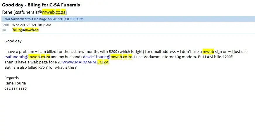 I signed up for a two year 350mb contract with Mweb in February 2009. Within the first few months I was already looking forward to the day that I would cancel this contract in February 2011, I even saved the date as a reminder on my calendar. I had to change my package a few times during these two years due to the ridiculous charges for additional data used, as well as the amount of data that I required depending on the circumstances at the time. I changed to a 1G option in September 2010 because I was having issues with our wireless connection at work. When I changed to the 1G option I did so at the Mweb store in Cresta. They said it would be perfectly fine to do this and did not make any mention of another two year contract or renewal of my contract.