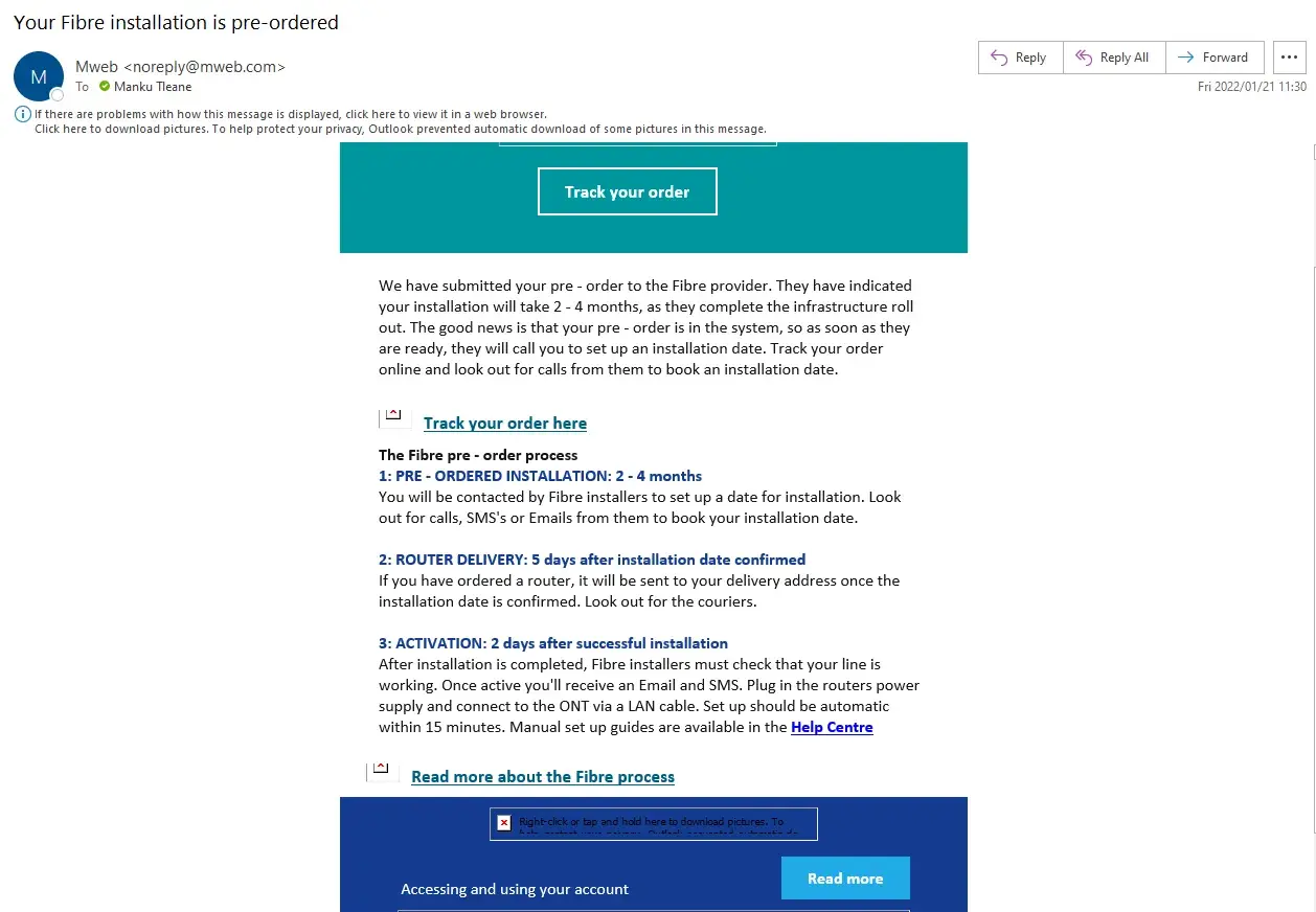 Again an sms on 7 Feb 2022 from MWEB that fibre was still being rolled out by Evotel.