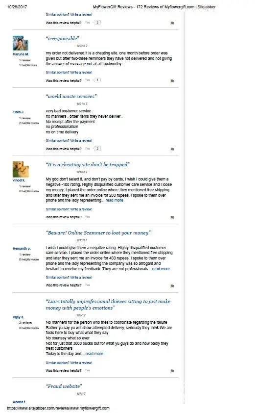 I ordered flowers and chocolate from the website www.myflowergift.com. I was shocked, when they delivered my order. The chocolate was cheap and without any taste. The bouquet looked like crap and the flowers were old. I sent several complaints and asked the seller to provide the compensation, but of course no one replied and no money was returned. Scam, scam, scam. They are liars, scammers and thieves, so don’t deal with them.