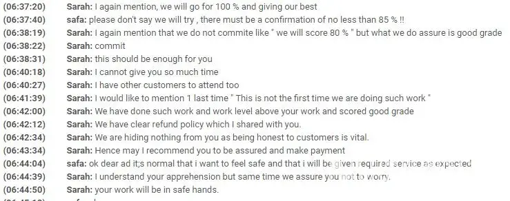at the beginning they were so kind, giving attention to me and agreed about all my conditions and kept calling me and sending me to convince me about their service, then after i transferred the money, i was surprised of the very low grade they scored which made me failed in my master, i contacted them many times through email and i got no respond at all and i contacted them through the online chat and their Sarah was very rude when i asked for her support, then wen i mentioned that they should refund my money, she ignored me, now all i got after i paid high amount is ignorance .