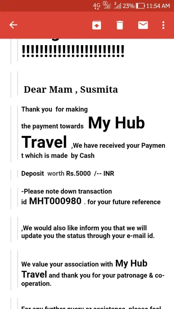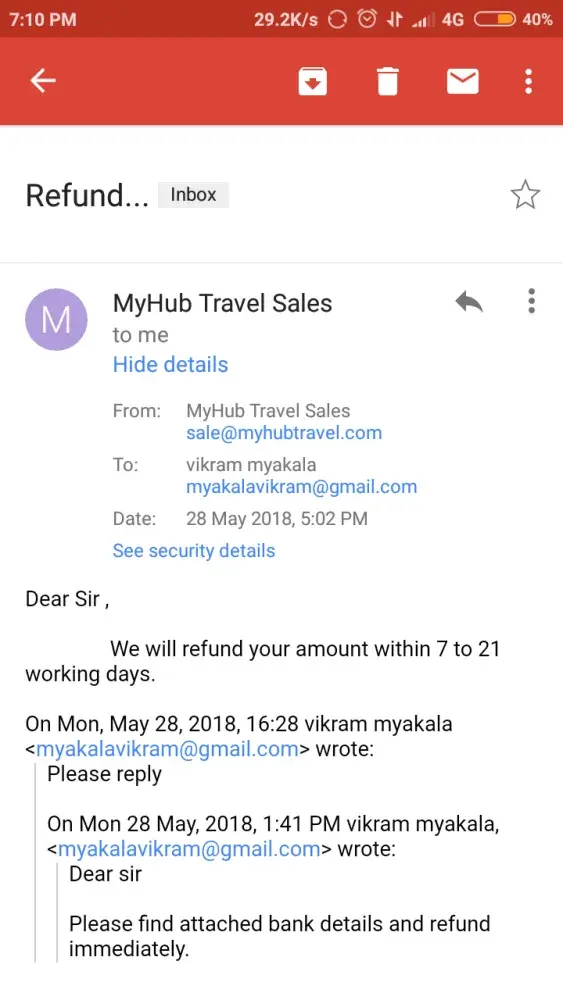 No positive response from My Hub Travel and other sources. Not refunded me an amount of Rs. 41000/-