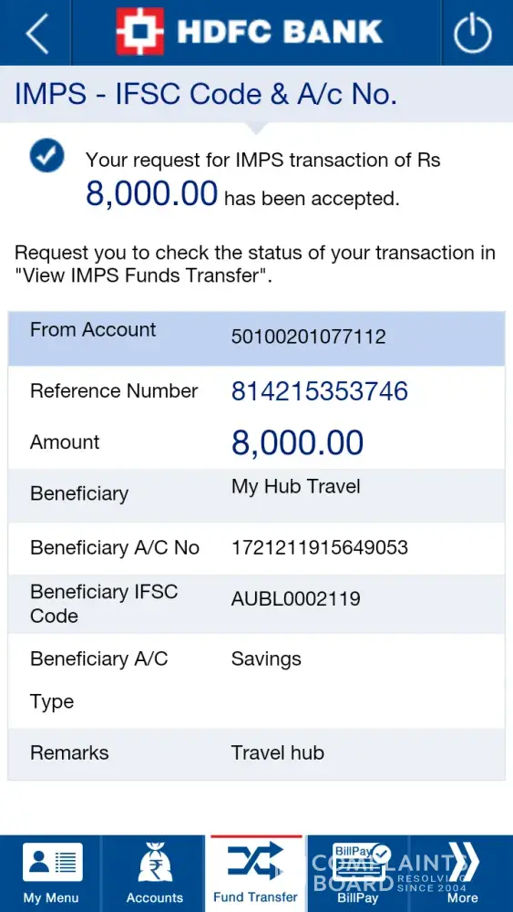 I had made a complaint regarding non-refund of advance paid to My Hub Travels. I am giving below the complain matter which was also acknowledged by Complaintsboards as well as My Hub Travels. The company had requested for time. It is almost 2 months since I have complained, but I am yet to receive the Advance amount of Rs.14000.00