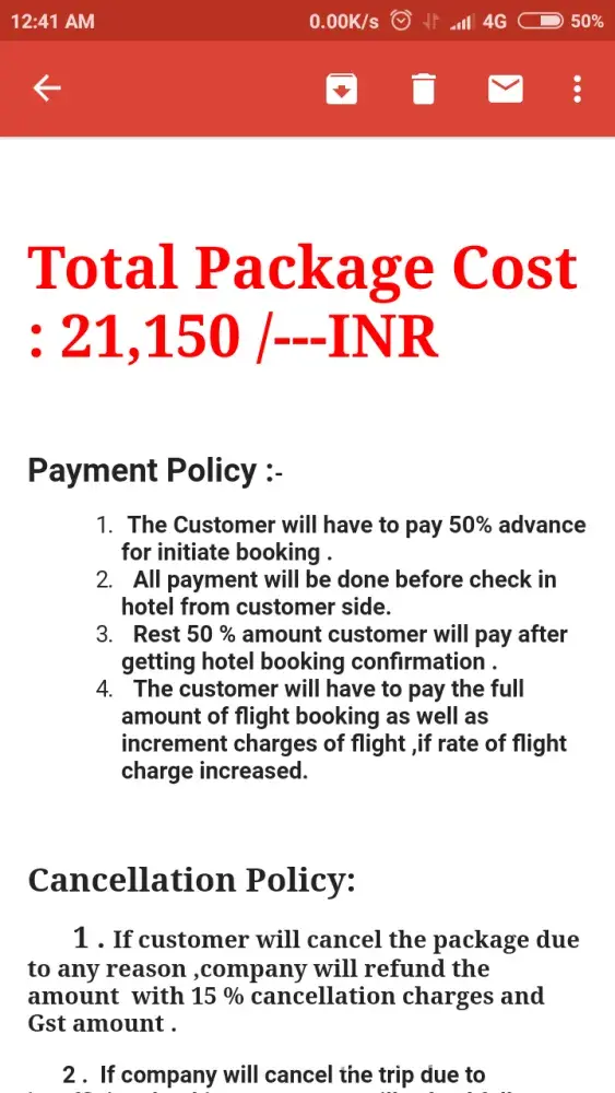 But after getting 50percent amount as per deal they insisted to pay the ready amount so as to receive booking coupons. I paid the whole sum...and after getting the whole package amount they started to send more amount and to increase the package amount. I refused and asked them to return my money back . But till now I have not received my money. I am helpless and really don't know what to do and how...