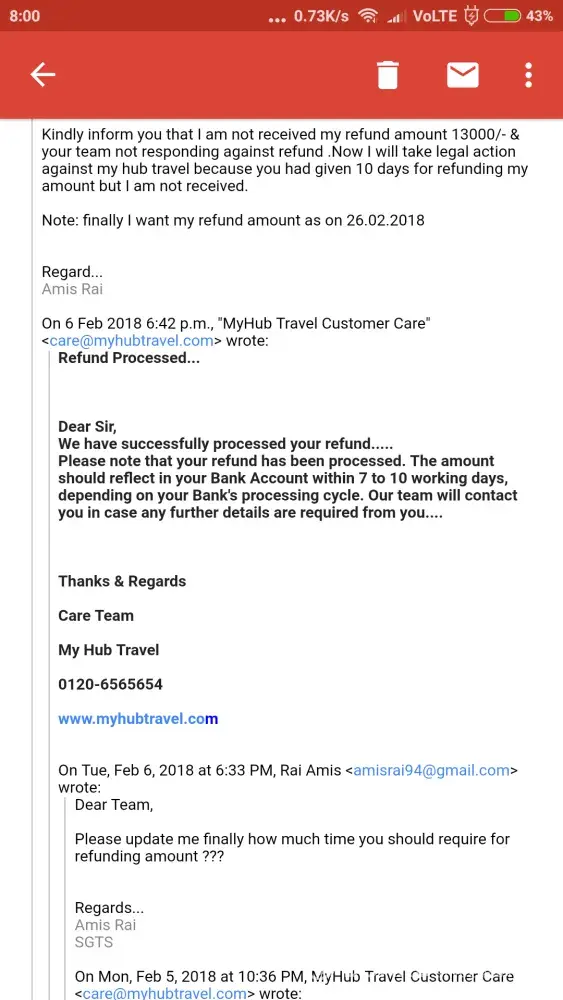 I have not yet received any refunded amount so far. It’s big harassment to me and my family. They tortured me mentally, it’s fake company, all the staff speak lies. I request you kindly to take necessary actioned against this travel agency so that in the future it should not happened to anyone else. I have all the details of correspondence and amount transferred etc.