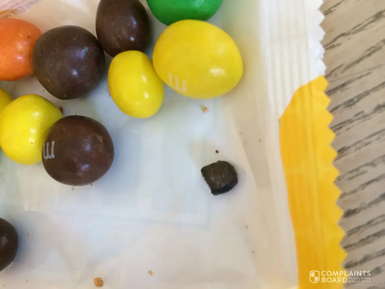 I was enjoying my m&m's when suddenly I noticed a black spot on one of them. When I investigated further I came to realise it was a small fly, squashed into the sweet. I felt ill after seeing this and was very unhappy and unable to enjoy the rest of the sweets. I have attached photos down below.