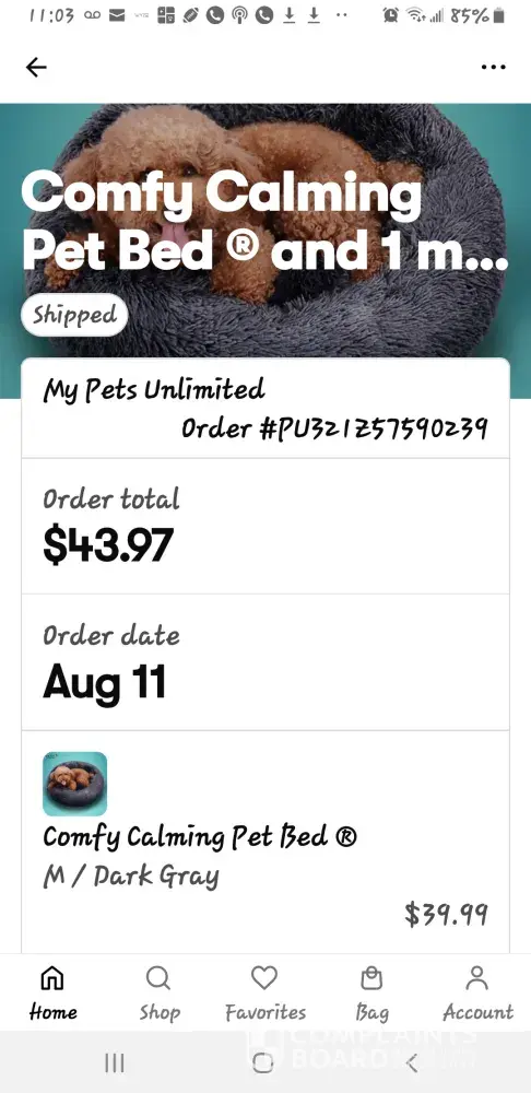 I ordered 2 comfy beds on a BOGO offer on Aug 11 and never got nor can email be sent