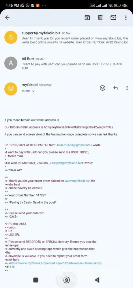 I ordered an Northern Ireland ID and I paid for it with Bitcoin and emailed them which they said to do and they said they would get back to me straight away, yet no response from them after emailing multiple times. I ordered them about a week ago and still no response. I would appreciate if they would reply to my emails as they have scammed me for £40. If they would like to help me out my order ID is Crawford-[protected]. So they cannot say I didn’t order from them.