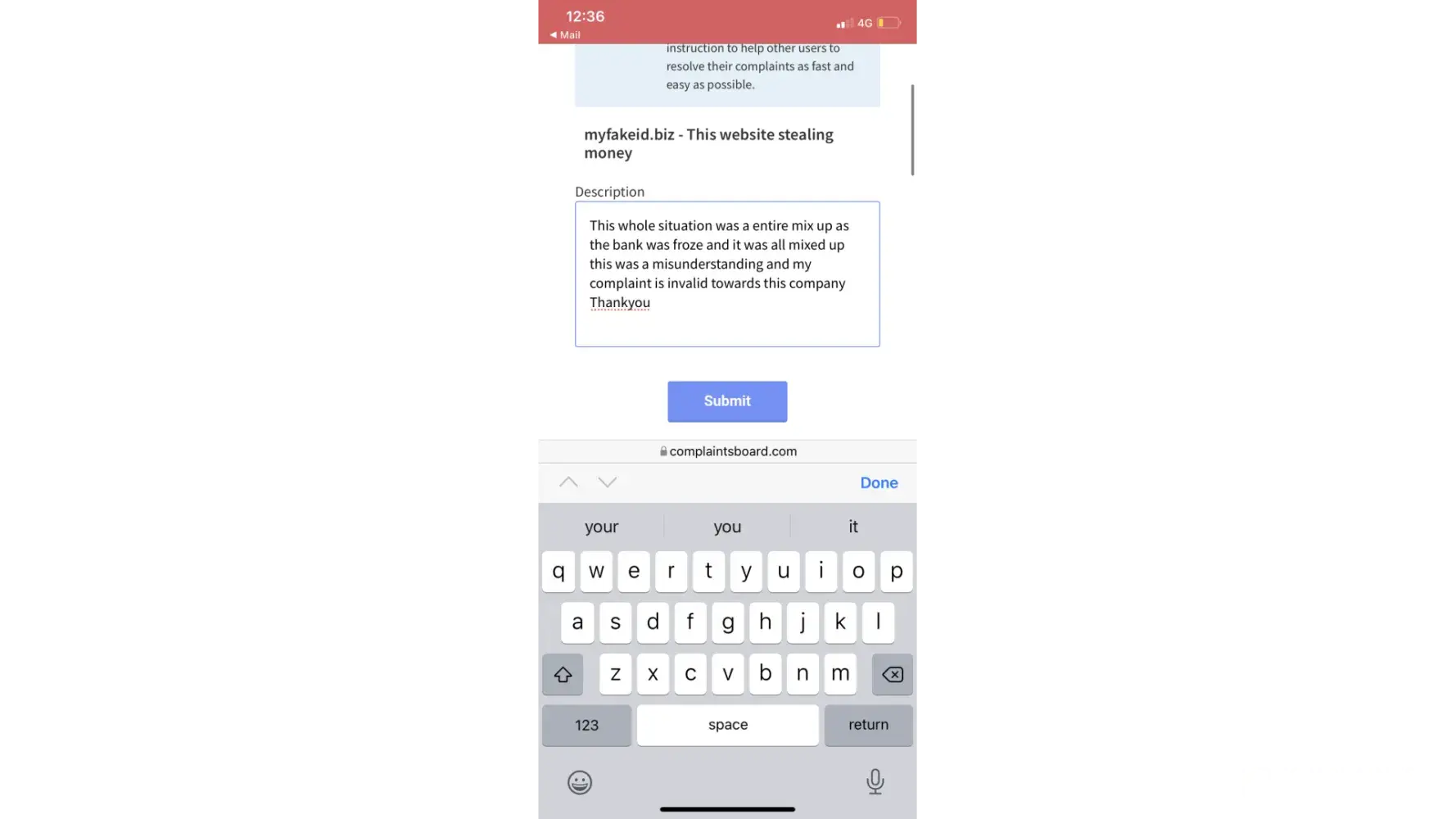 Desired outcome: i would like my id or the money i sent back