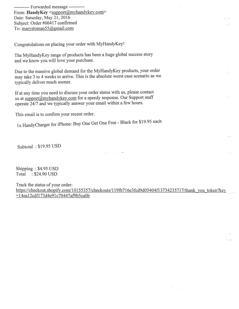 This 'Handykey' ads came through facebook and it was easy to purchase. However after waiting for 2 months (Facebook ads came on 18th May 2016 and I purchased on the day), no products sent so far. The company sent order confirmation using 'Shopify' apps and it appears to be professional at first but since then, no news, no products! So many similar complaints are posted I discovered now, after waiting patiently for 2 months. This company should be prohibited to use Facebook Ads or Shopify apps as it is a scam. Please, could anyone escalate this to Facebook and Shopify? This type of business should not be allowed otherwise the social media's trust level will be impacted and other genuine businesses would be affected negatively. Thanks.