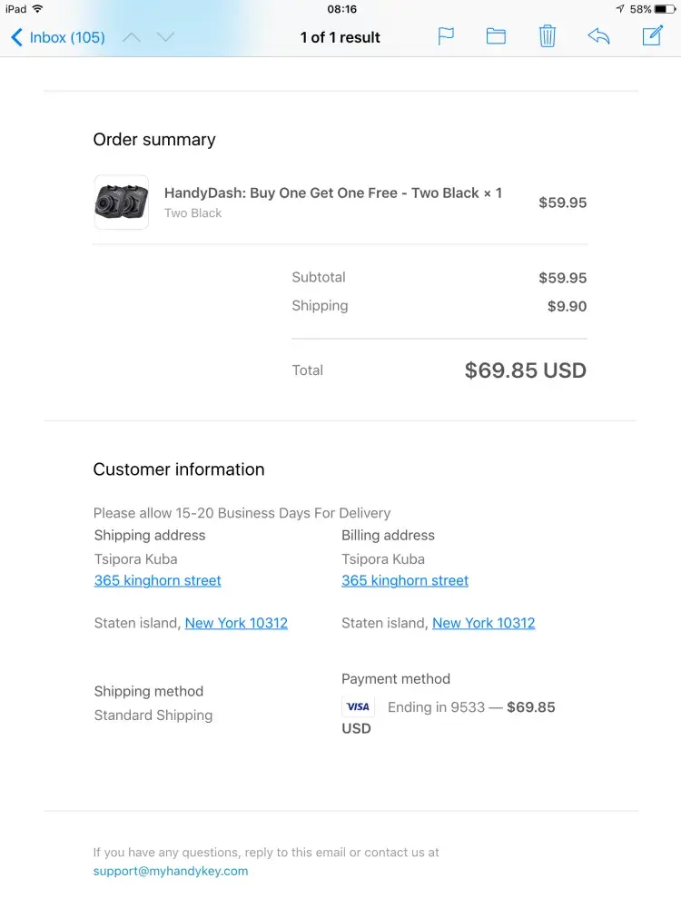 Ordered and paid for on July 15, 2016. Nothing yet. I emailed them in August, & they replied back on August 29th, 2016, and said we apologize for the inconvenience. The Handy Dasha is in high demand at the moment & as a result there has been some delays. Once your order has been shipped, you will be notified with an email that includes your tracking number and details on how to track your order. My order #114371. Now I tried to email them and I get the complaint/mhhandkey-dashcam-buy-one-get-2nd-free. So what's being done about this?