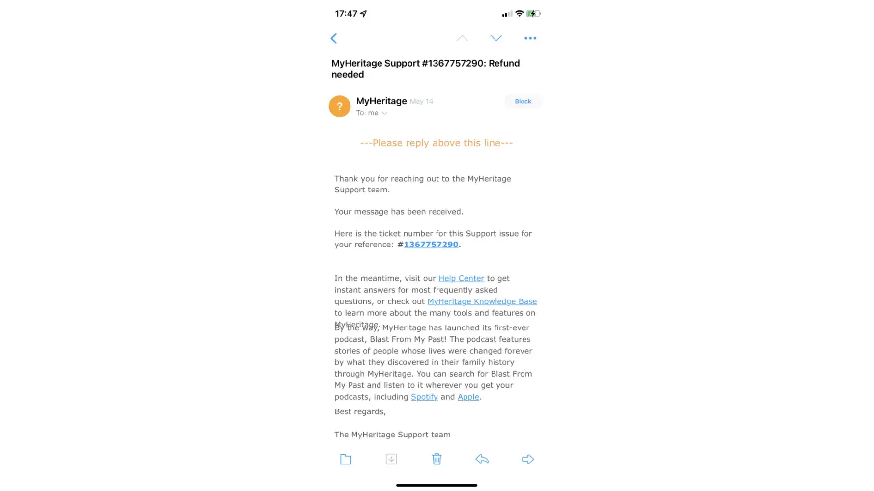 I have phoned My Heritage, but only an automated voice response, then they promised to call me back, but it never happened.