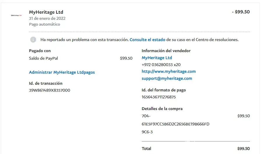 El 31 de febrero se myheritage ltd realizó un cobro a mi cuenta de paypal, pese a que yo dejé de utilizar el servicio de prueba hace mas de medio año como se puede apreciar en la segunda imagen que adjunto.