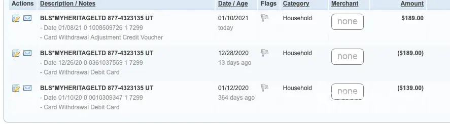 BLS*MYHERITAGELTD, phone number [protected], in the amount 0f $89.00. Found this when I started doing my tax return for 2020. I did not use this service and would like a refund. Thank you, Rosemary [protected]