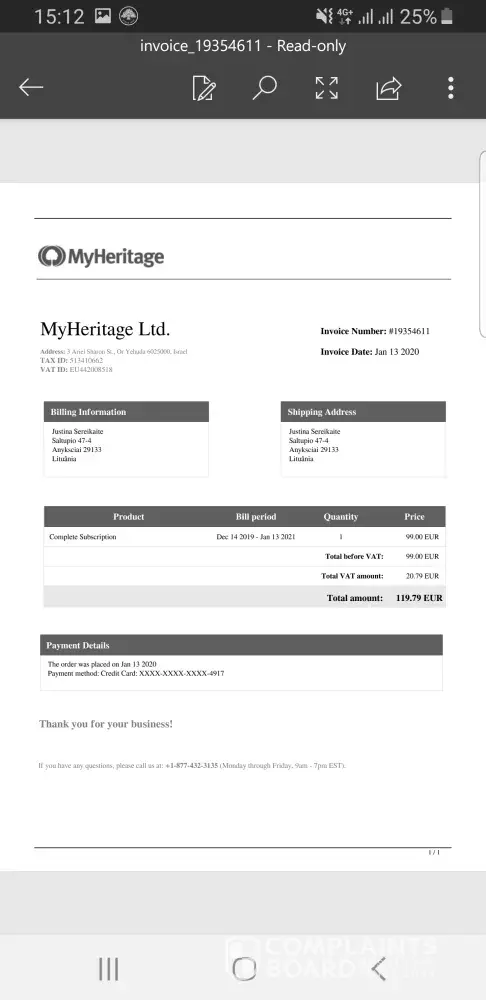 I got notified that a payment was made from my bank account for annual subscription, but I'm not going to use those benefits, just wanted to take a dna test. Maybe I can get a refund? Coudn't find any email adress, where can I can I send you all information, so I am writing here with hopes, that somebody could help me. I add a payment screeshot and invoice that was send to me. If you need anything more contact me via email justina.[protected]@gmail.com or [protected]@gmail.com (myheritage.com account email)